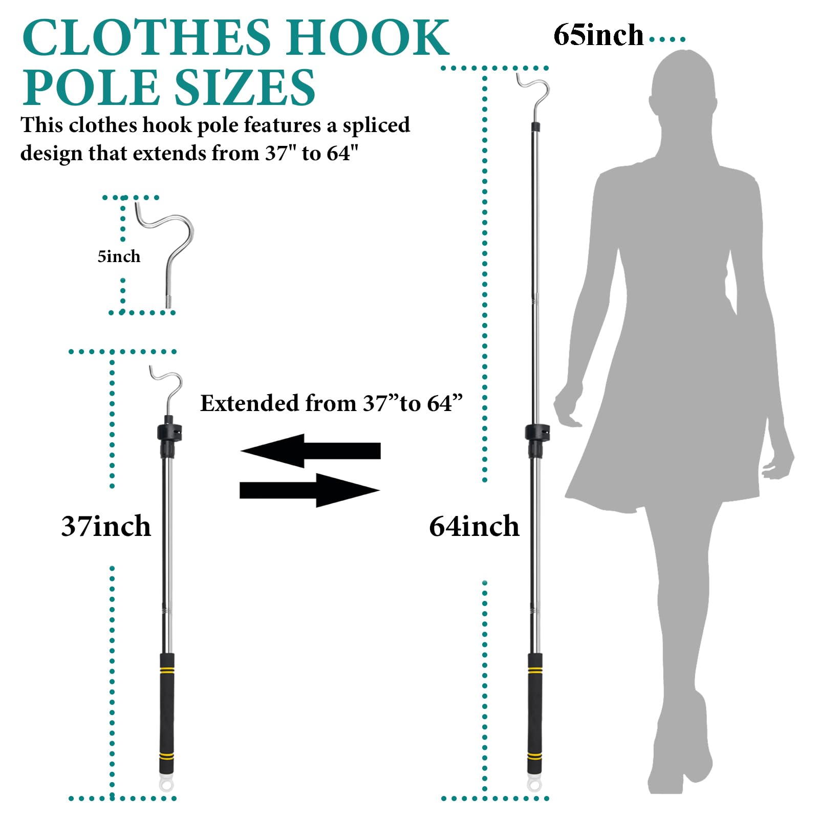 Greeily Clothes Hanger Reaching Hook Telescopic Adjustment clothes hook pole Light and can Extend from 37" to 65" with 4.7 "Hook and Sponge Handle.