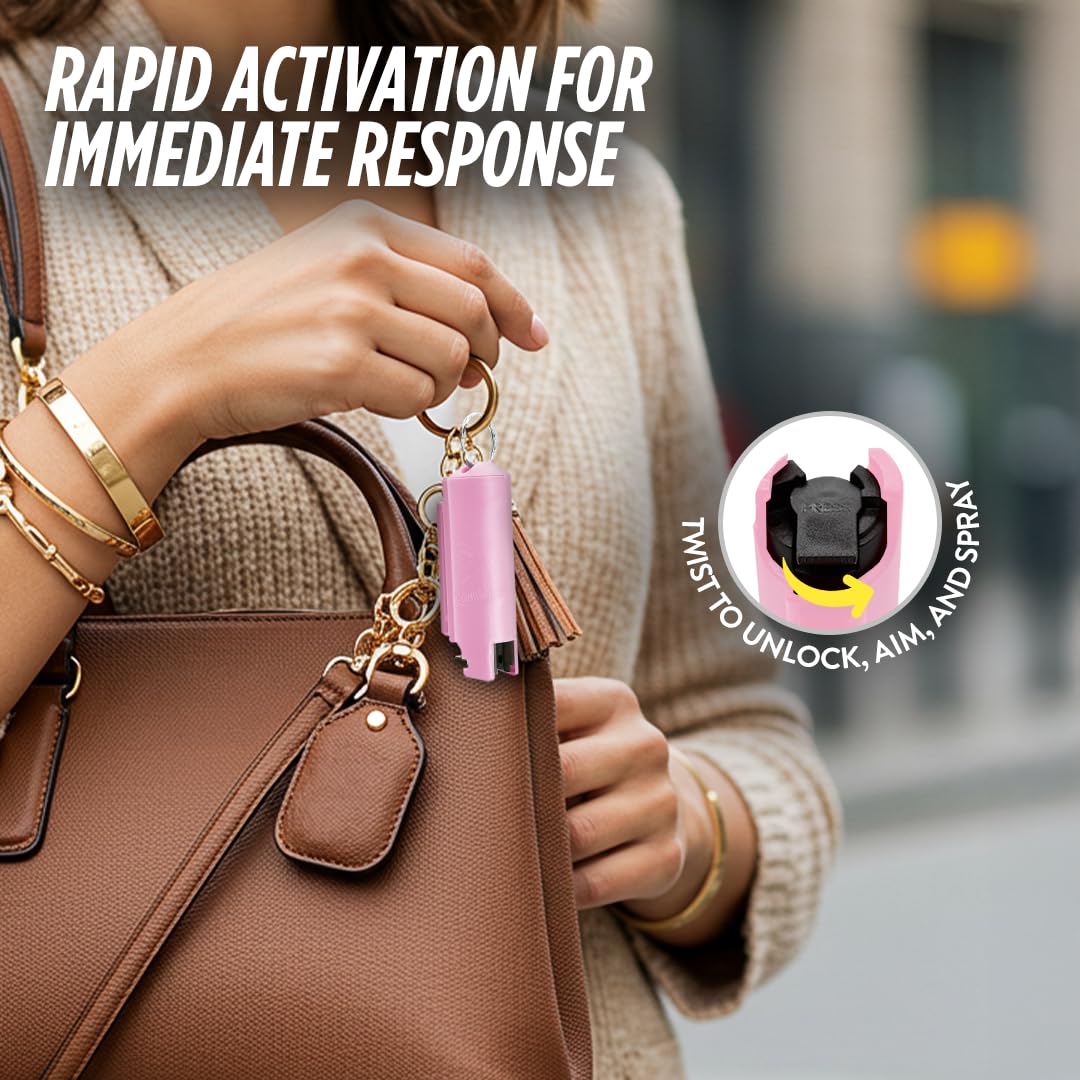 - Twist-Lock Safety For Peace of Mind – Featuring a patented twist-lock safety cap, this design prevents accidental discharge while remaining quick and easy to activate when needed. Carry your pepper spray keychain with confidence knowing it’s secure