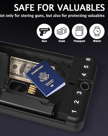 - Durable Construction & Practical Interior: Built with reinforced carbon steel and a thick metal coating, this biometric gun safe for handgun is designed to withstand external damage. The interior includes built-in lighting for clear visibility in low-light situations, allowing you to easily access your items even at night