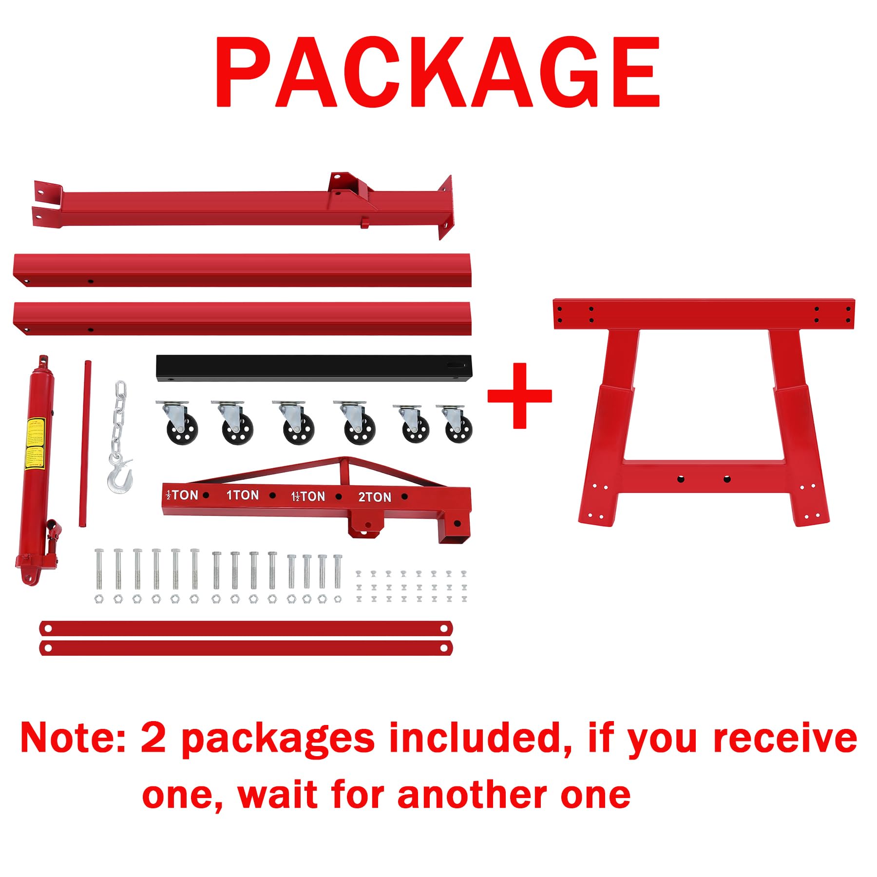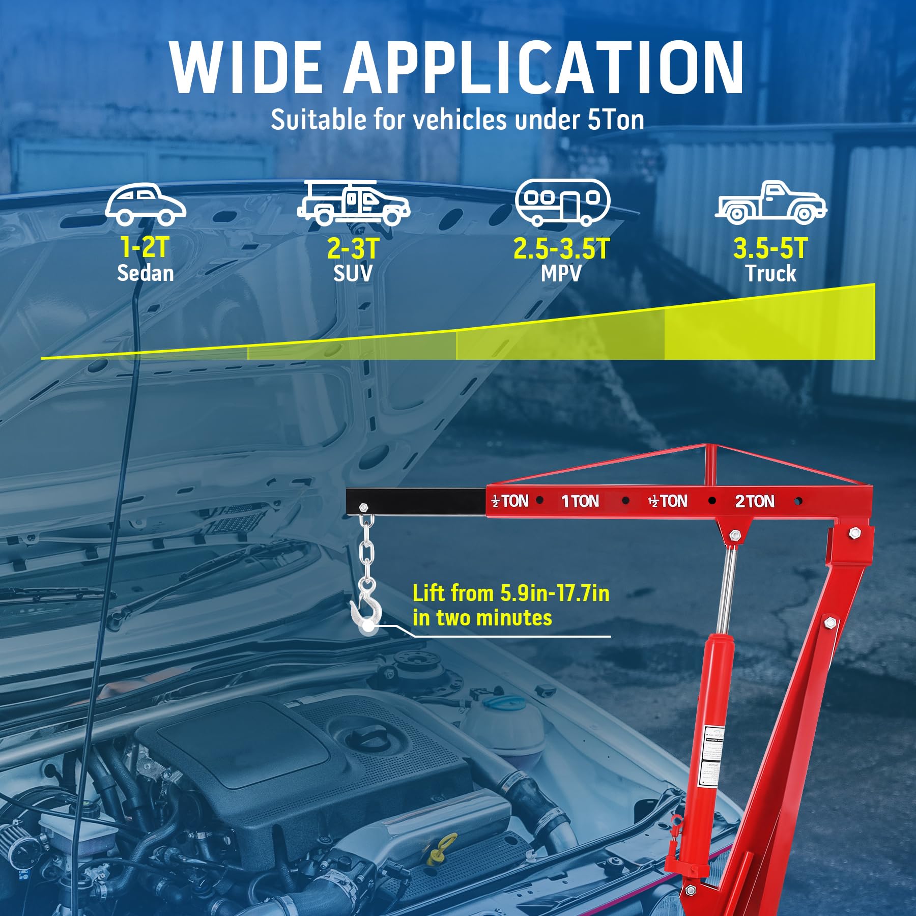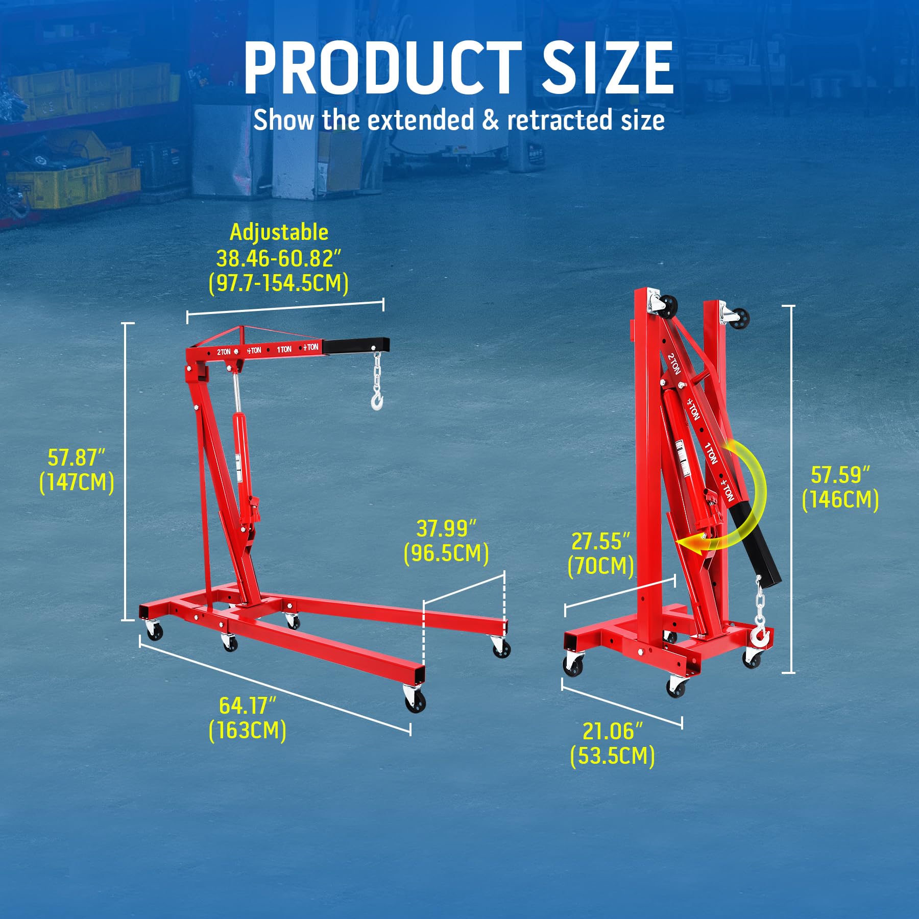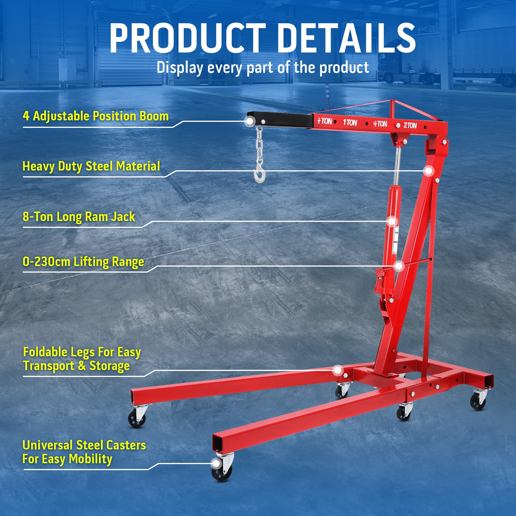H-YEEU Hydraulic Engine Crane Hoist, 2 Ton Folding Motor Hoist Cherry Picker Heavy Duty Steel 4400lbs Lifting with 6 Casters for Garage Workshop(Red)