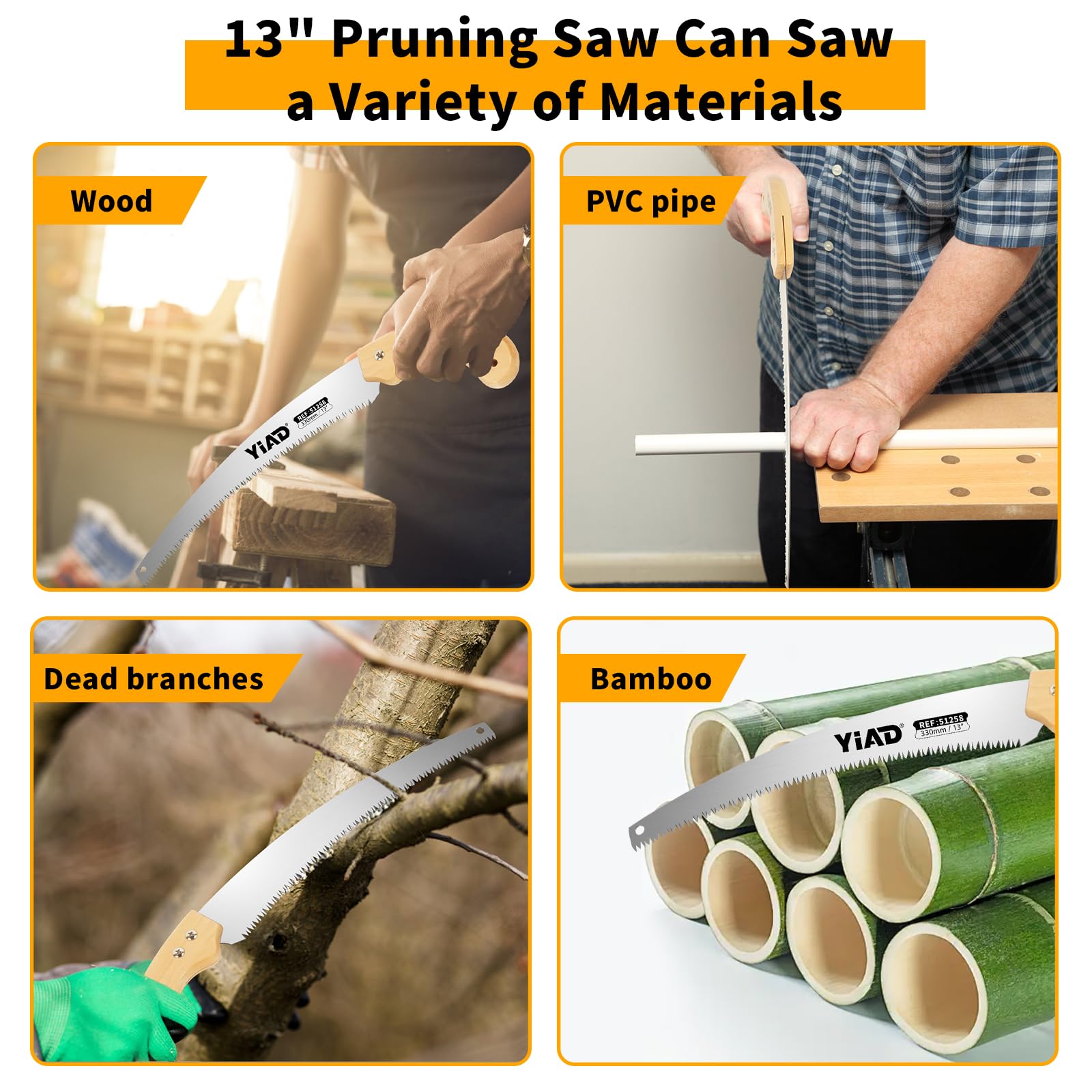 - Efficient Tree Trimming and Wood Cutting:The Yiad 13" Hand Pruning Saw features a sharp, curved blade designed for fast and precise cuts. Whether you're trimming tree branches in the yard or preparing firewood during camping trips, this handsaw delivers exceptional performance, saving time and effort