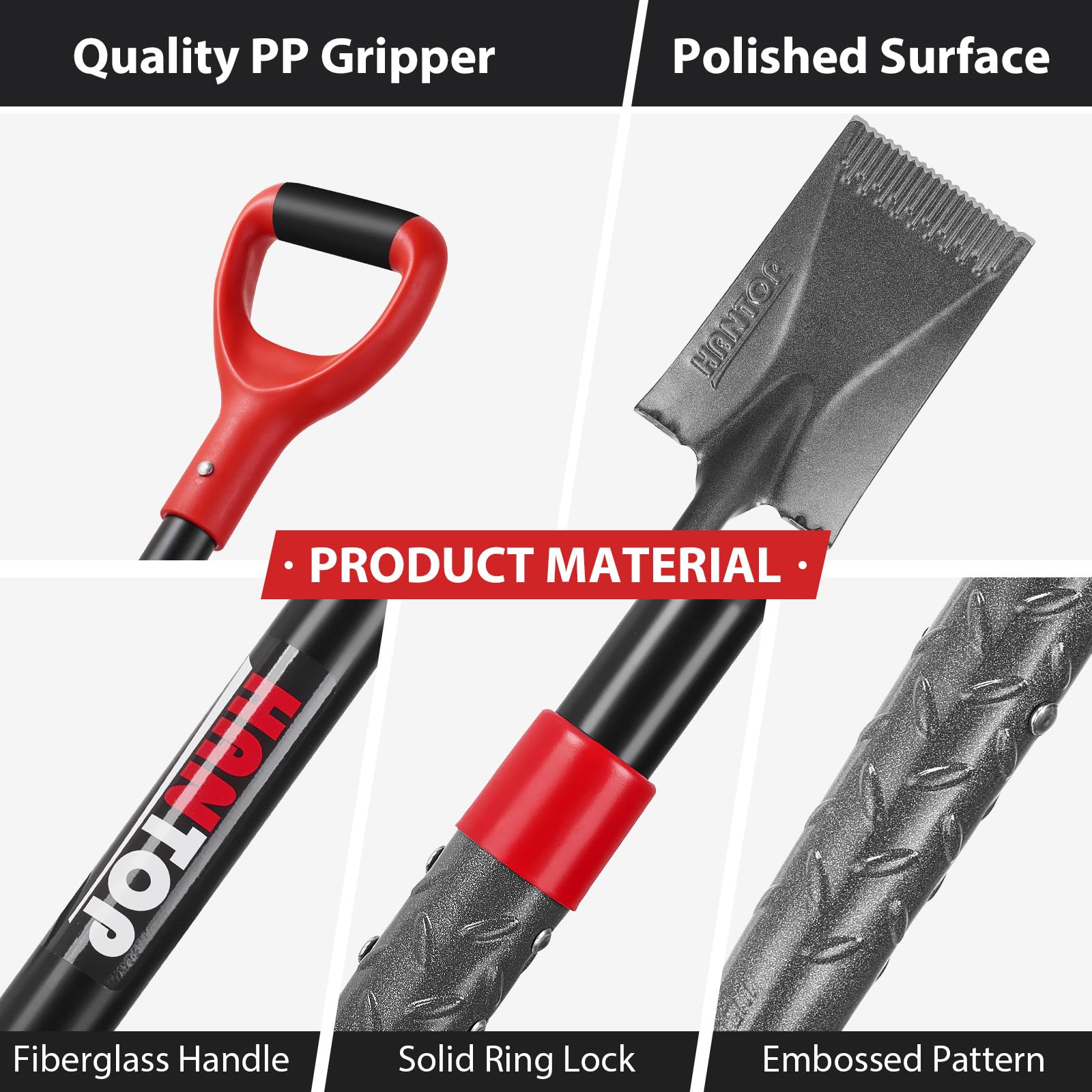 - MATERIAL - The head of the flat shovel is made of 1050MN steel,the handle is made of fiberglass and the hand grip is made of PP