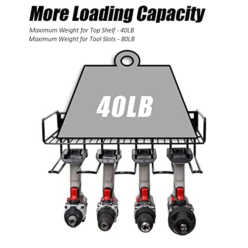 - [Much More Loading Capacity] This power tool holder with heavy duty design would help you to load maximum 100 lb tools by using all 4 wall mount anchors. This power tool storage, for top shelf max load 40 lb and below 4 tool slots with max capacity 80 lb.