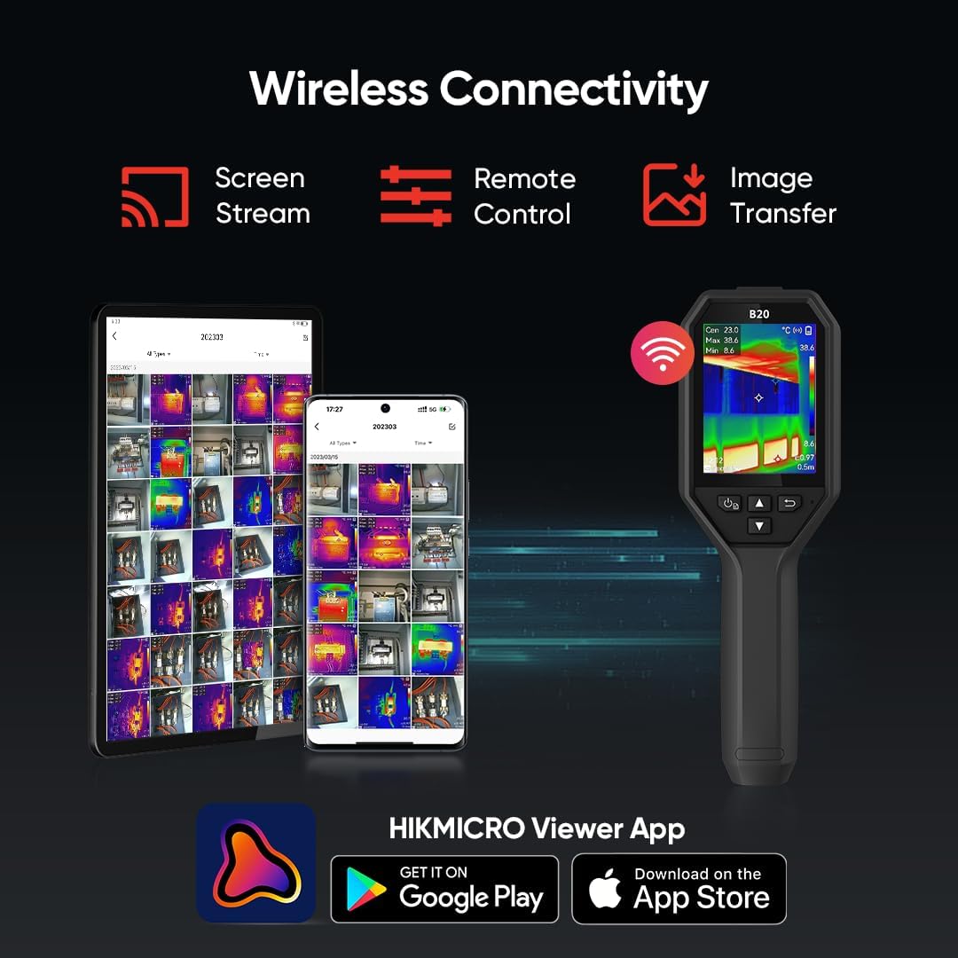 - WiFi Connectivity: Connect to mobile devices via built-in Wi-Fi and the HIKMICRO Viewer App to live stream your devices to at most 3 tablets or phones, better analyze the temperature anomalies on bigger screens, share the images at real-time.