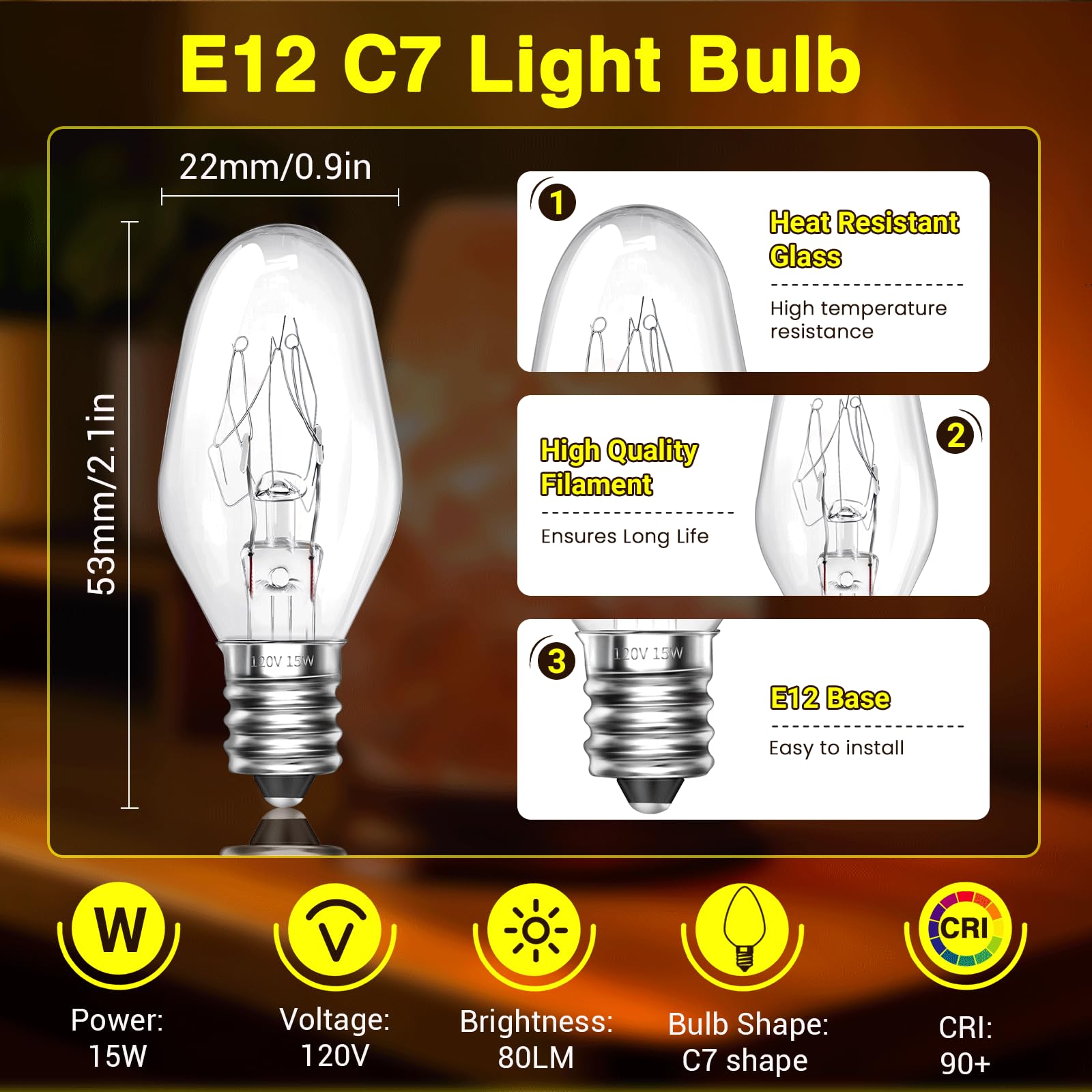 - 【E12 C7 LIGHT BULBS】Designed for durability, this E12 base bulb offers high-temperature resistance up to 300° and a 2000-hour lifespan. Ideal for Scentsy plug-in warmers, night lights, and salt baskets.