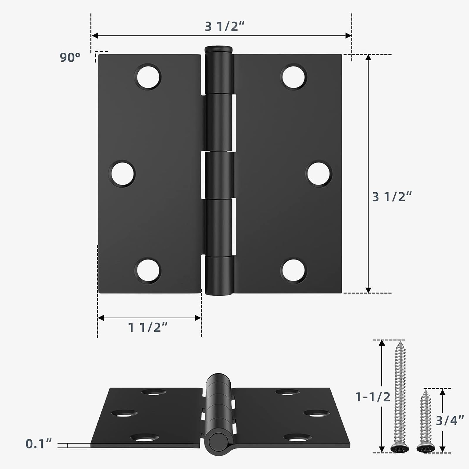 - 【Complete Set】 The package includes everything you need: 6 standard 3.5'' door hinges with square corners and 6 screw holes, #9 3/4'' screw x 36, and #9 1-1/2'' screw x 1.
