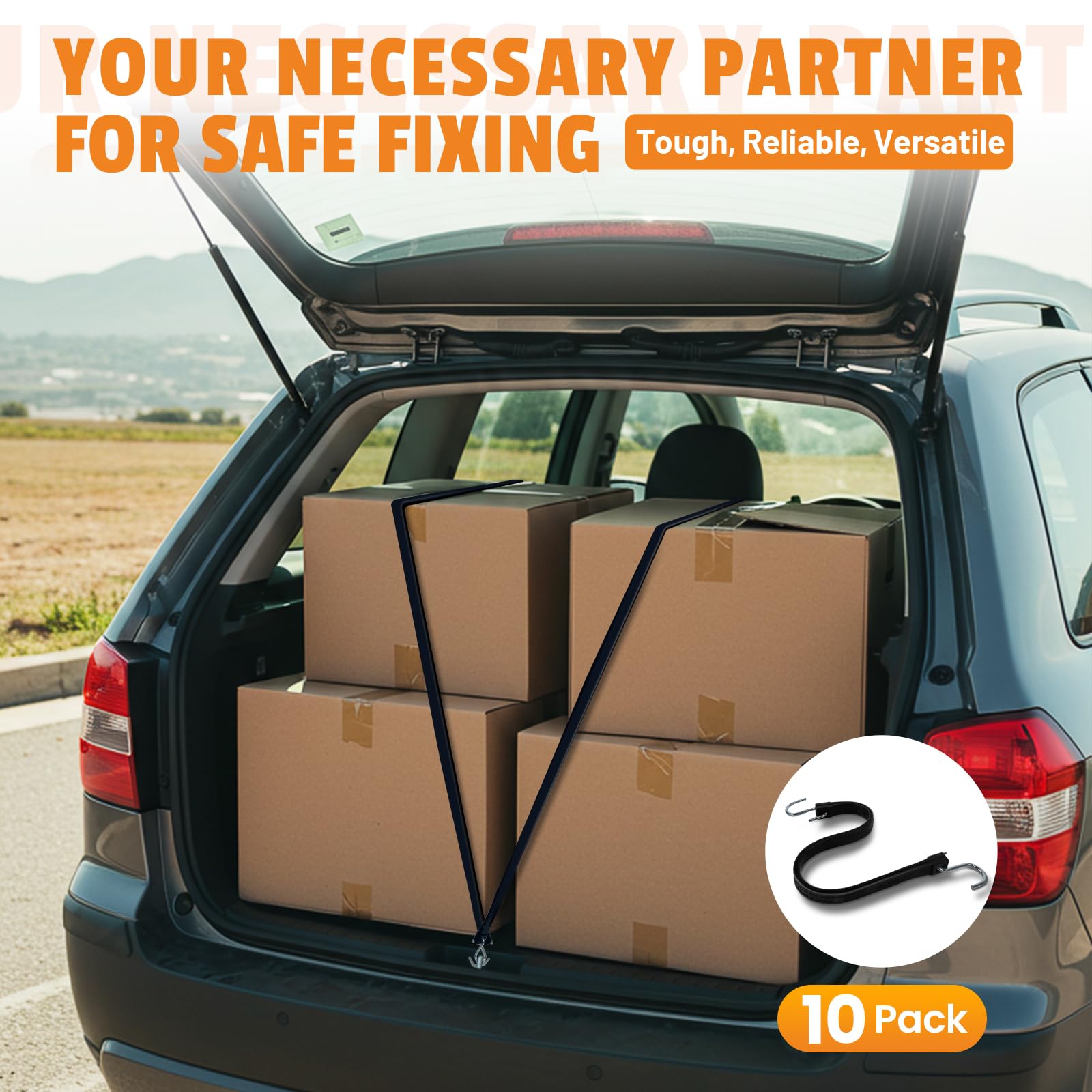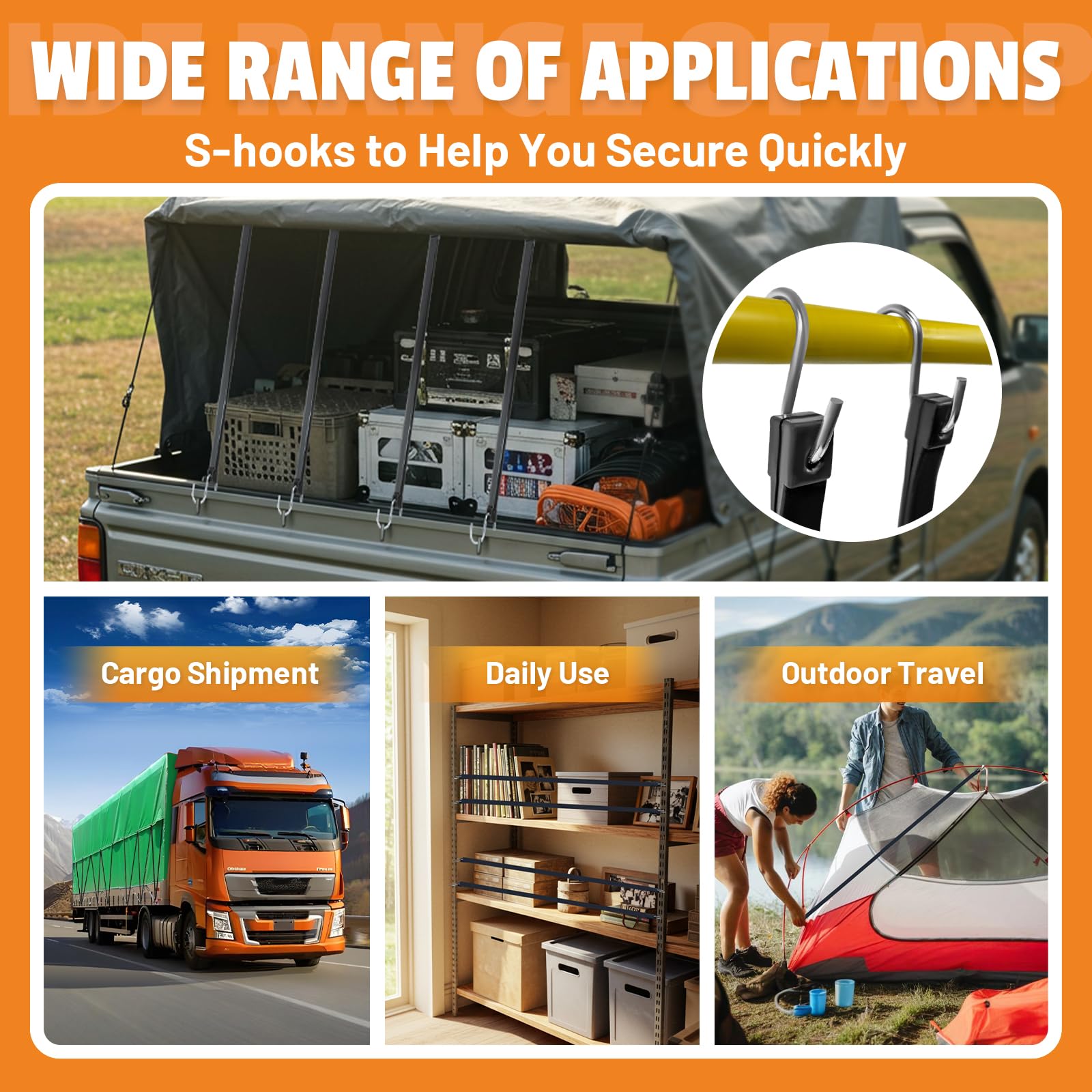 - RUSTPROOF S-HOOKS: Our bungee cords heavy duty outdoor are equipped with metal S-hooks with a rust-proof coating on both ends to ensure quick and secure fastening. In just two seconds, you can secure your items in place without worrying about slipping