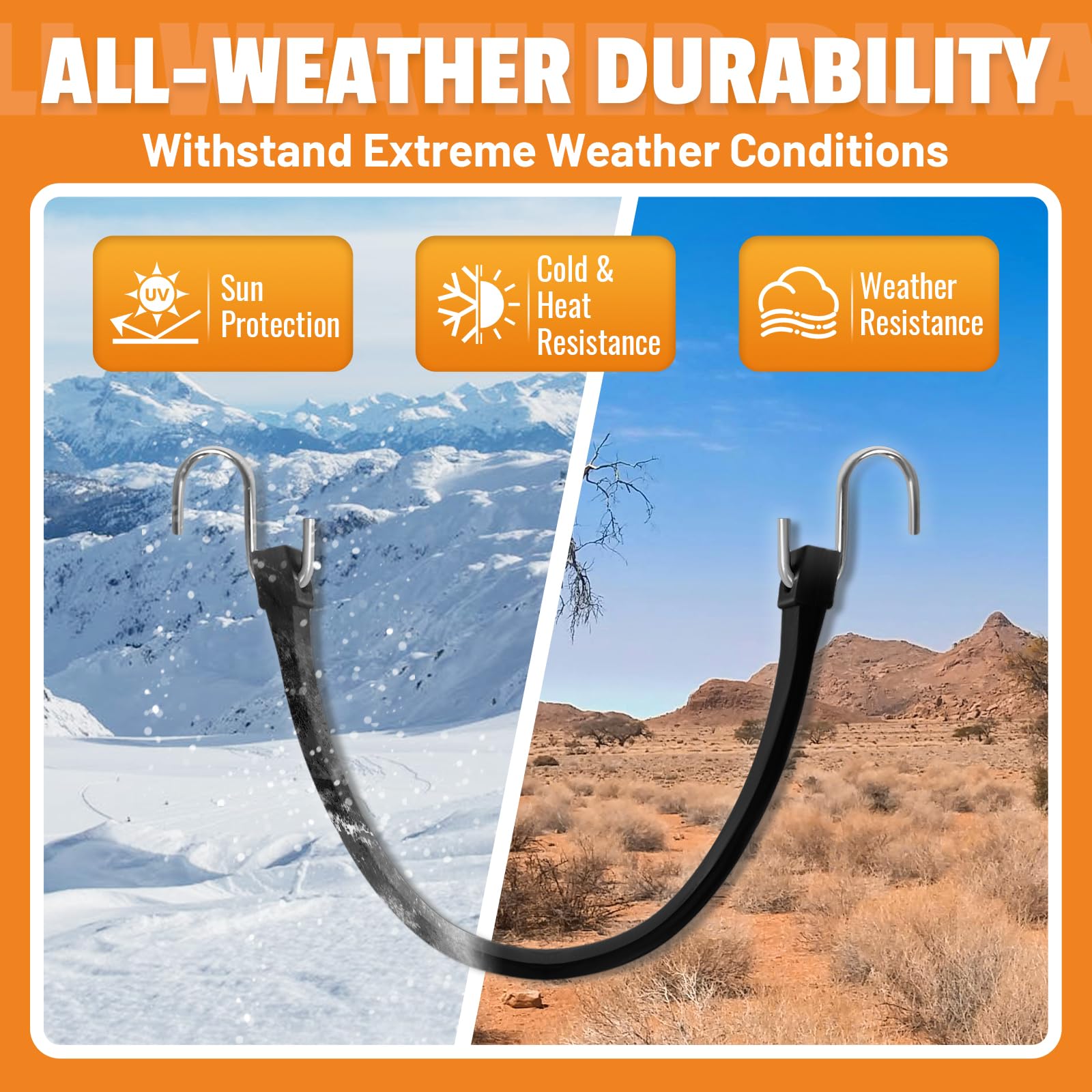 - ALL-WEATHER DURABILITY: HOXWELL bungee cords with hooks heavy duty can stand up to extreme weather conditions. They were not easy to crack or degrade in material, even after days of continuous heavy rains
