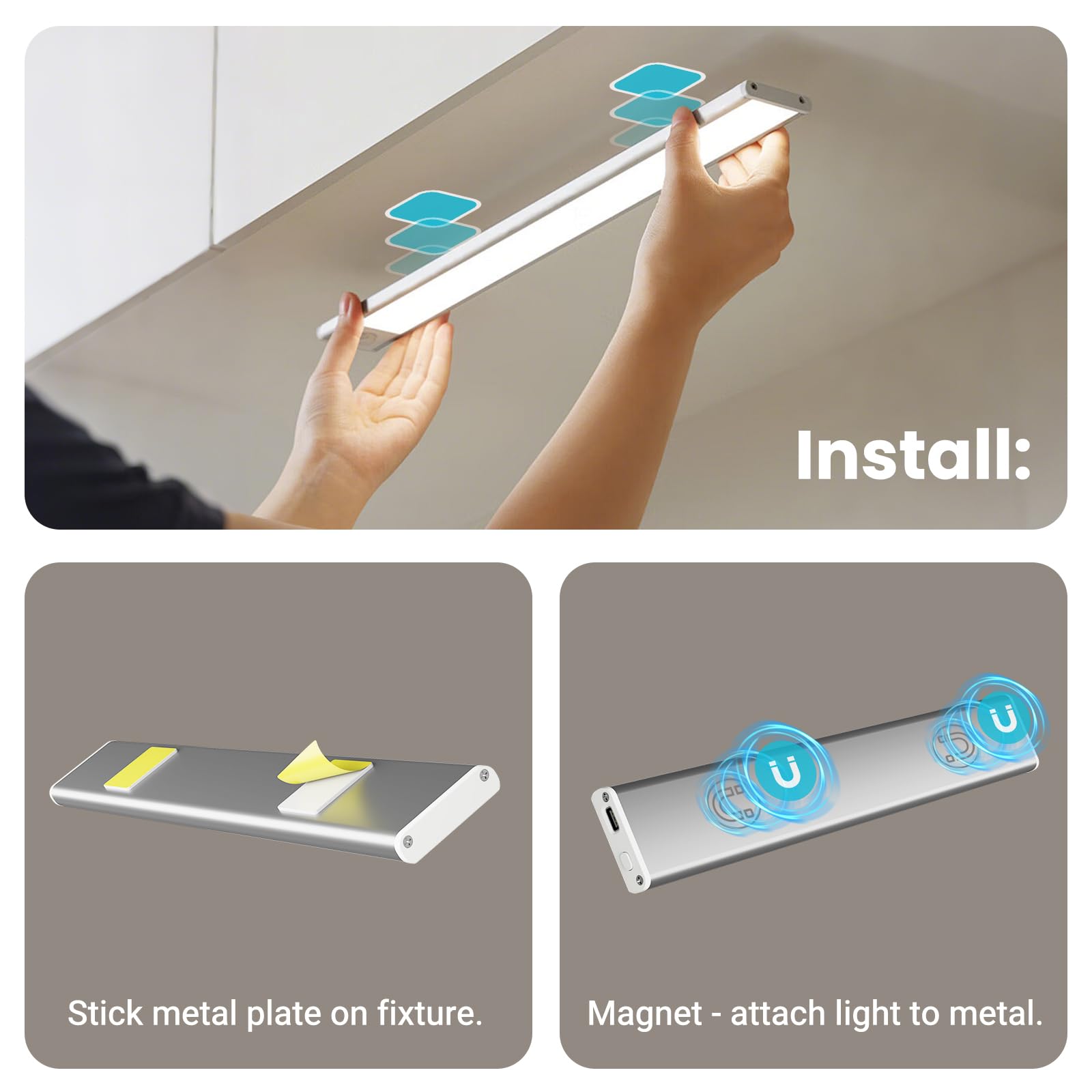 - 【Portable Usage& Easy Installation】 With built-in strong magnets for direct attachment to iron surfaces. If the surfaces is not mental,using the included adhesive metal plate. Detach simply if you charge or reinstall your LED bar lights. Suitable for various situation like kitchen, bedroom, closet, cabinets, counter, pantries, basement, stair, hallway, shelves, and outdoor camp