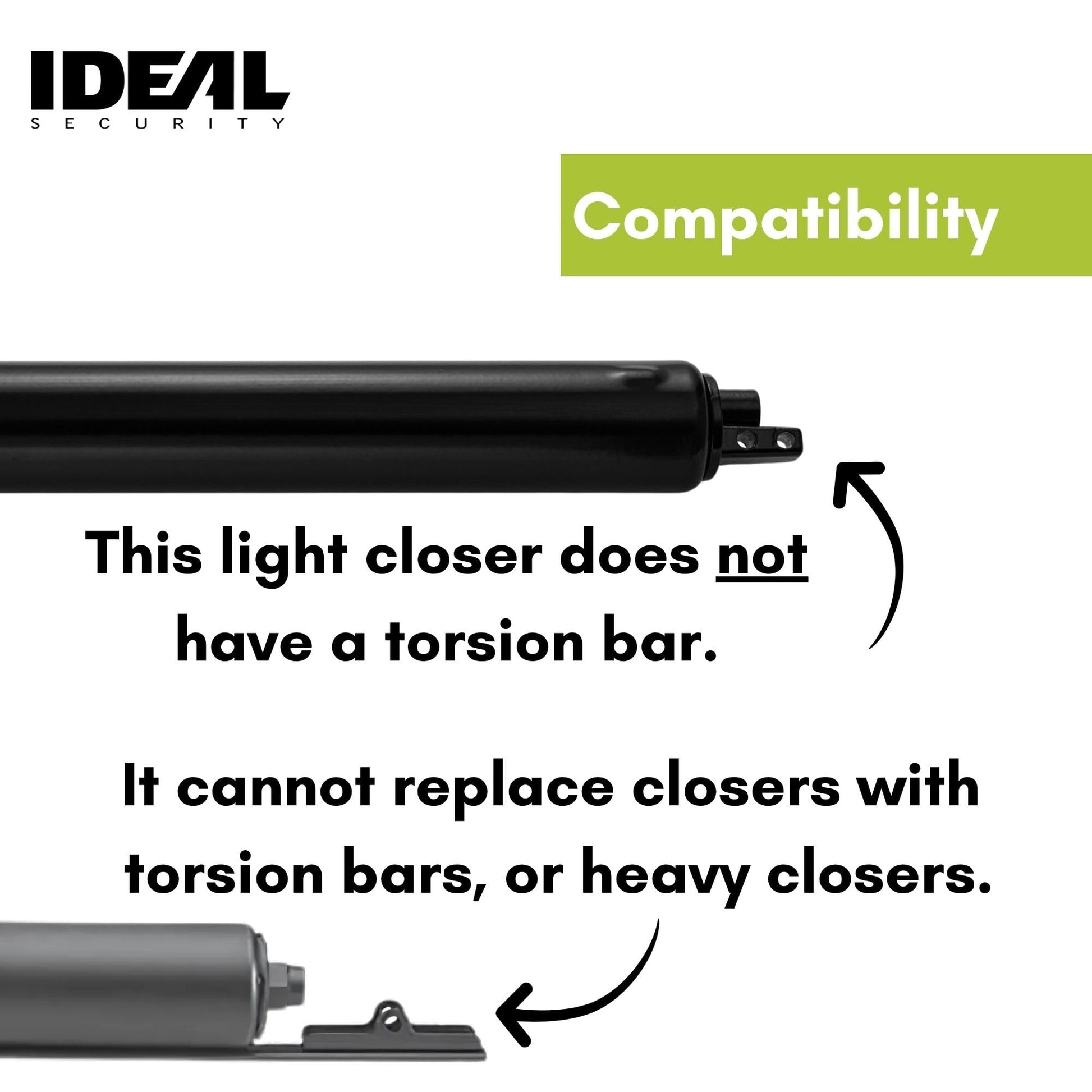 - Dimensions: This Ideal Security storm door closer has a length of 9” and a diameter of 1.25”; when selecting replacement door closers for home use, be sure to select the exact same type of closer that came with your door