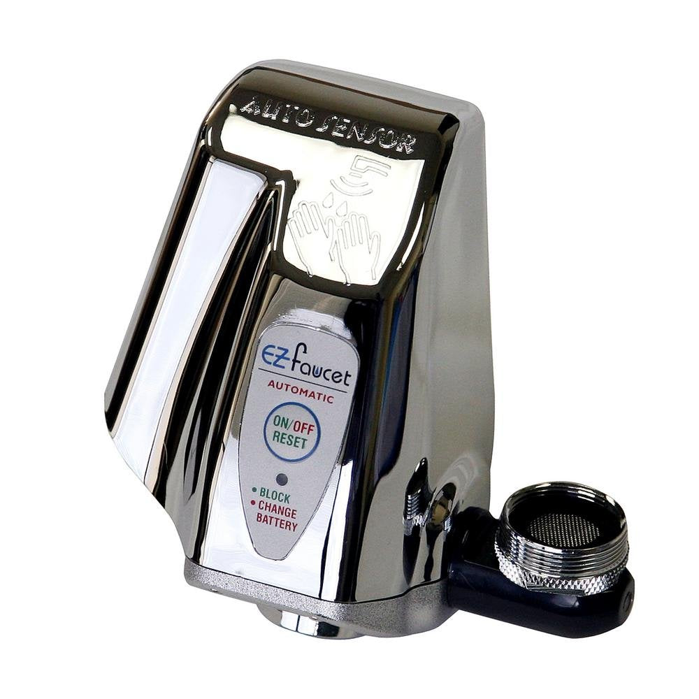 Think green and save green (your dollar bills). A bathroom faucet generally runs at 2 gallons of water per minute. By turning off the tap while brushing your teeth or removing your make up, a person can save more than 200 gallons of water per month. EZ Faucet Adaptor does just that. With its sensor automatic function, the water will turn off when your hands or any object is removed from the sensor range, saving up to 70% of water per hand wash; it is good for the environment and easy on your wallet. To install, just screw on the unit after removing the existing aerator. It does not require any plumbing modification that can cost time and money. No more turning and touching the faucet handles while you are cooking, cleaning, or fixing your car in the garage. Simply approach, wash, and walk away. Save water, money and the environment- With its sensor, automatic on/off operation, it eliminates cross contamination of germs and gives you a piece of mind knowing that you will never come home to a flooded bathroom or kitchen again. Control water flow and temperature with existing faucet handles anytime- DIY Installation, retrofit most standard sink without plumbing modifications- Simple and convenient to use, suitable for children, elderly and also people with arthritis where the EZ Faucet activates without turning the faucet knobs- World's only patented faucet mount adaptor that equips with Infrared Sensor and Point-N-Lock technology- Fits standard US faucet exit size- Water Pressure: 10 - 125psi- Powered by 4 AAA batteries that last up to 1 1/2 year of operation - Package comes with Touch-free faucet adaptor, 1 rubber washer, hexnut wrench, and quick installation guide.