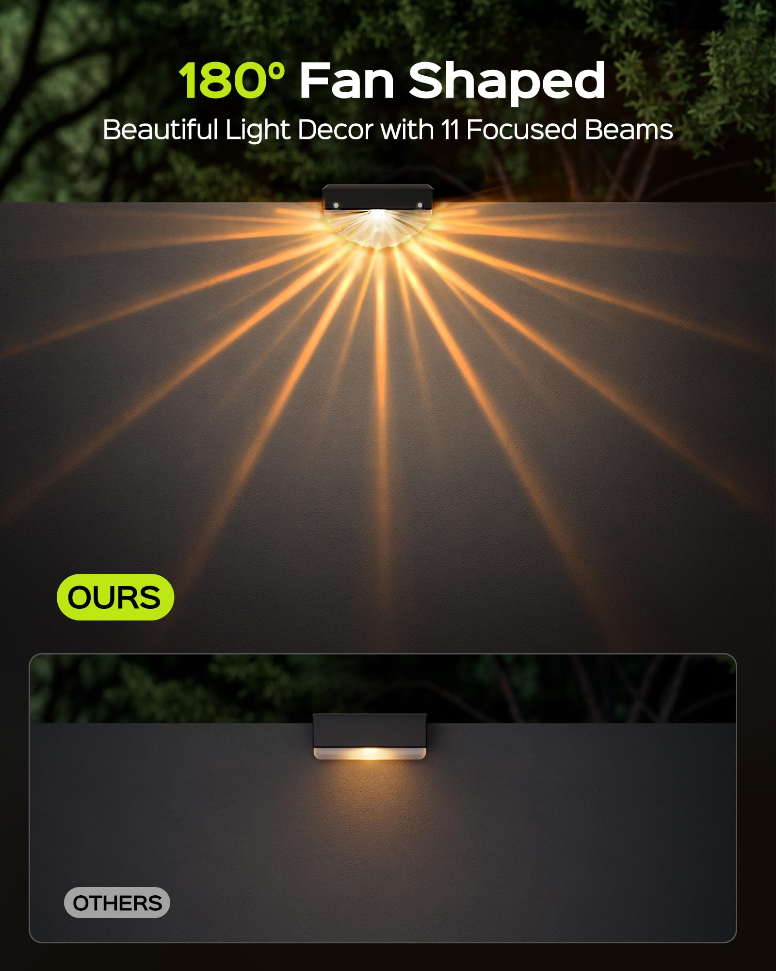 - INNOVATIVE FAN-SHAPED LIGHT: Transform your outdoor fences with our unique fan-shaped solar fence lights. The wide 180° illumination angle paired with 11 focused light beams creates a stunning visual effect that’s both decorative and practical. The lens-focused light beams make your fence, steps, patio, or deck stand out beautifully at night. Perfect as solar deck lights, solar dock lights, or stair lights, these compact but powerful small solar lights elevate your outdoor ambiance.