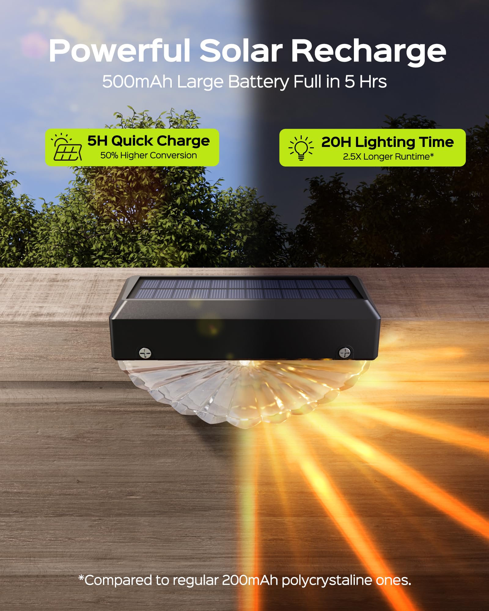 - 20H EXTRA LONG RUNTIME: Equipped with a high-efficiency micro-grid solar panel, these fence lights solar powered fully charge in just 4–5 hours and shine for up to 20 hours—that’s 2.5 times longer than typical solar lights. No more short runtime or weak lighting—just reliable, all-night glow, even on cloudy days with intermittent sunlight exposure.