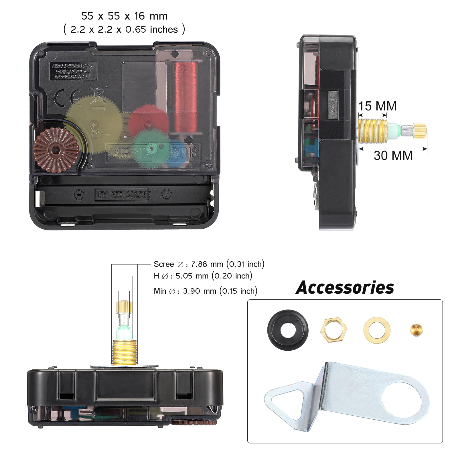 - Size of the kit: the high-torque long shaft clock movement is approx. 30mm/ 1.2 inch, and the thickness of the panel cannot exceed 15 mm/ 0.6inch; The length of the hour hand is approx. 22cm/8.6inch, and the minute hand is approx. 29cm/11.4inch; The clock hands can be installed on a clock which is 24 inch in diameter at least