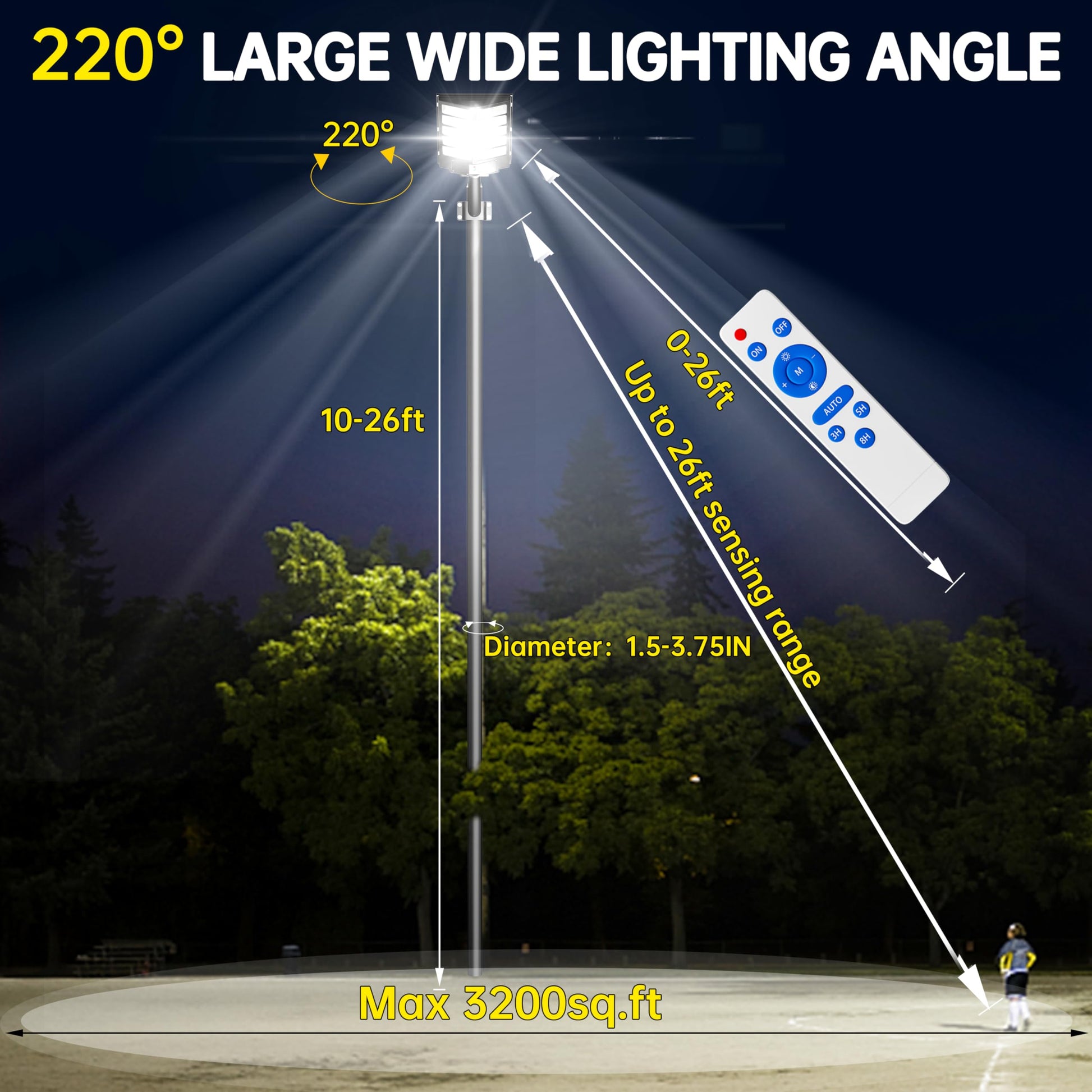 - 【220 degree large wide-angle lighting and Large illuminates area】Upgrade 2-way 220 degrees wide-angle lighting, it provides a wider range of lighting and brighter light compared with ordinary 180°commercial solar parking lot lights . The Illumination area is up to max 3000sq.ft , which covers more area. We suggest you install our parking lot lights commercial 16-26ft above the ground.