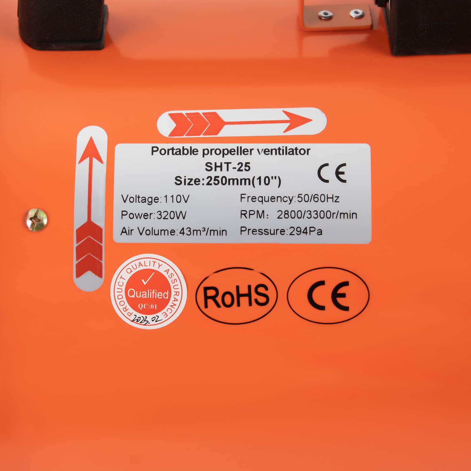 - High Efficiency: The 320W pure copper motor, 3300r/min speed, power fan with 7 blades and a diameter of 10inch, ball bearing, and stable structure can provide large airflow(43 m³/min), thus achieving fast and efficient ventilation and maximum air extraction, providing directional airflow for limited access areas, and improving your work efficiency