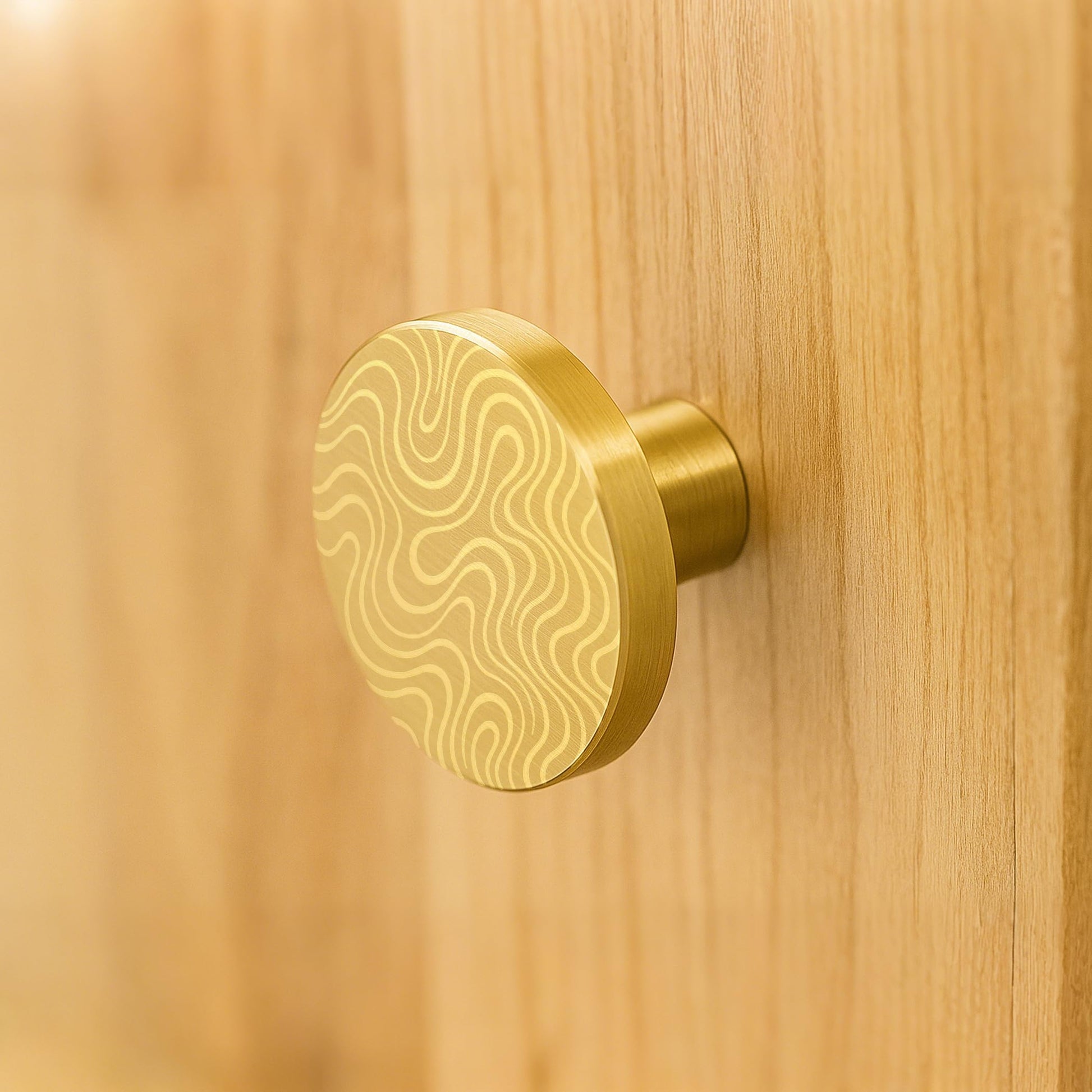 JKJOWPER 7-Pack 1 Inch Solid Brass Knobs - Round Brushed Gold Cabinet Knobs for Kitchen & Bathroom, Elegant Engraved Pattern, 2 Screw Sizes Included