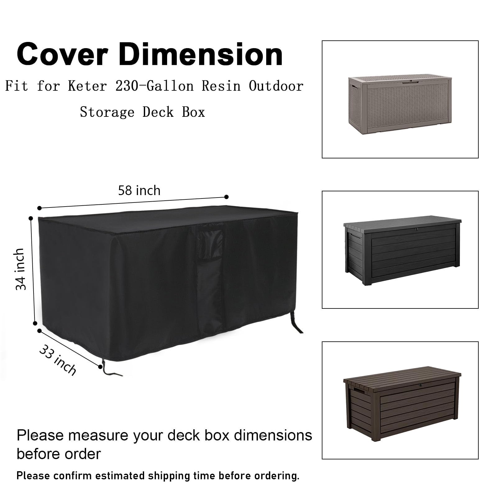 - Size: 58 x 33 x 34 inch; the outdoor cover is compatible with keter XXL 230 gallon plastic deck storage box,Can also be used for similar sized outdoor furniture; Note:Please measure your furniture before purchasing