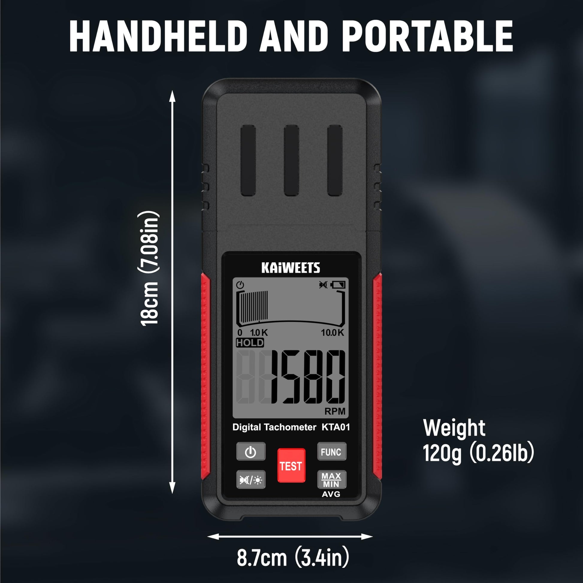 - Compact, Lightweight, and Easy to Carry: Designed for portability, this rpm meter weighs only 140g (including batteries). Powered by 3 AAA batteries with low power consumption (approx. 50mA), it's a reliable tool for on-the-go use in workshops, garages, or outdoor settings