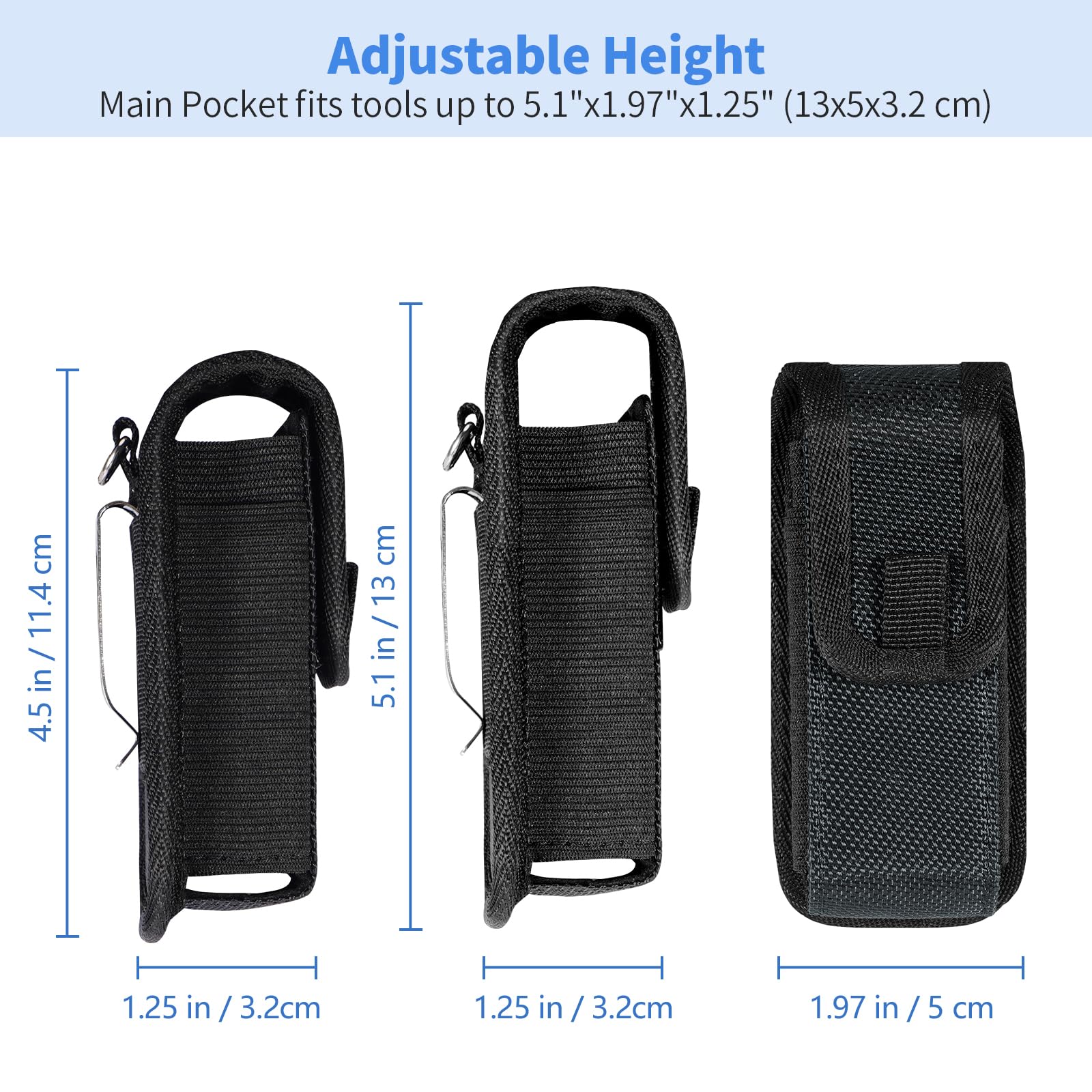- Adjustable Height: Size is 2"x 1.25" x 4.5"~5.1" The height of our multitool pouch is adjustable, that easily adjust cover to fit tool up to 5 inch in length. Compatible with Leatherman Wingman, Wave, Charge, Surge, Skeletool, Super Tool and other brands like Victorinox Swiss Army, RoverTac, Gerber. You can also carry an EDC flashlight and mini marker pen.
