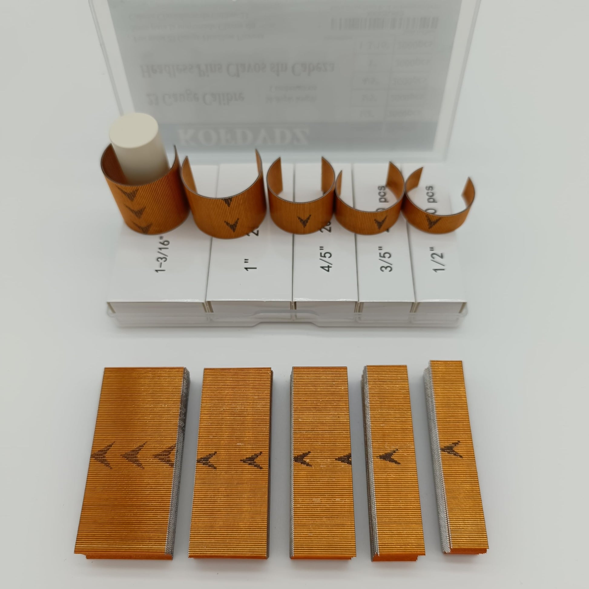 Details: This is a set of headless nail products composed of multiple packages of a single size. The headless nails themselves are made of relatively hard steel and treated with copper plating on the surface, which makes them less prone to rust. They can be inserted into various soft and hard woods and will not clog your nail gun, thus extending the service life of the nail gun. Each size of headless nail is separately packaged in a drawer box, with the length marked on the drawer box. It is easier to identify and carry, and can also protect nails very well.