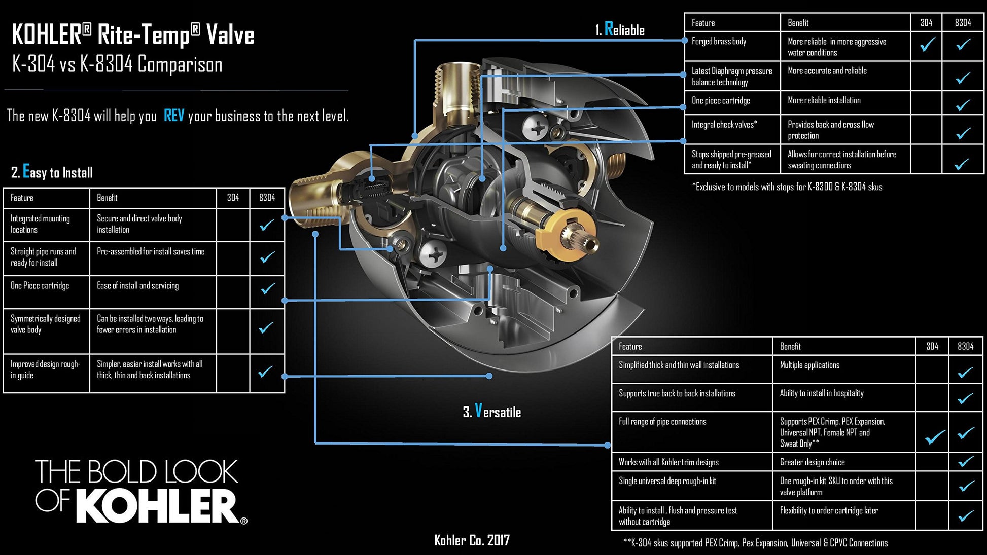Details: The new KOHLER Rite-Temp valve system sets new standards for ease of installation, application versatility, and long-term reliability, simplifying your plumbing project and providing maximum flexibility for future changes or upgrades. The Rite-Temp valve platform uses the latest pressure-balancing technology to provide anti-scald protection and temperature control for enhanced showering comfort. Once the valve is installed, select your finished trim and finish from KOHLER's comprehensive design portfolio. Should you decide to remodel in the future, simply change out your trim for the latest design without the need to change the valve installation. Designed for use in standard, back-to-back and thin wall installations. Pressure-balancing diaphragm technology maintains outlet temperature within +/- 3 degrees Fahrenheit during water pressure fluctuations.