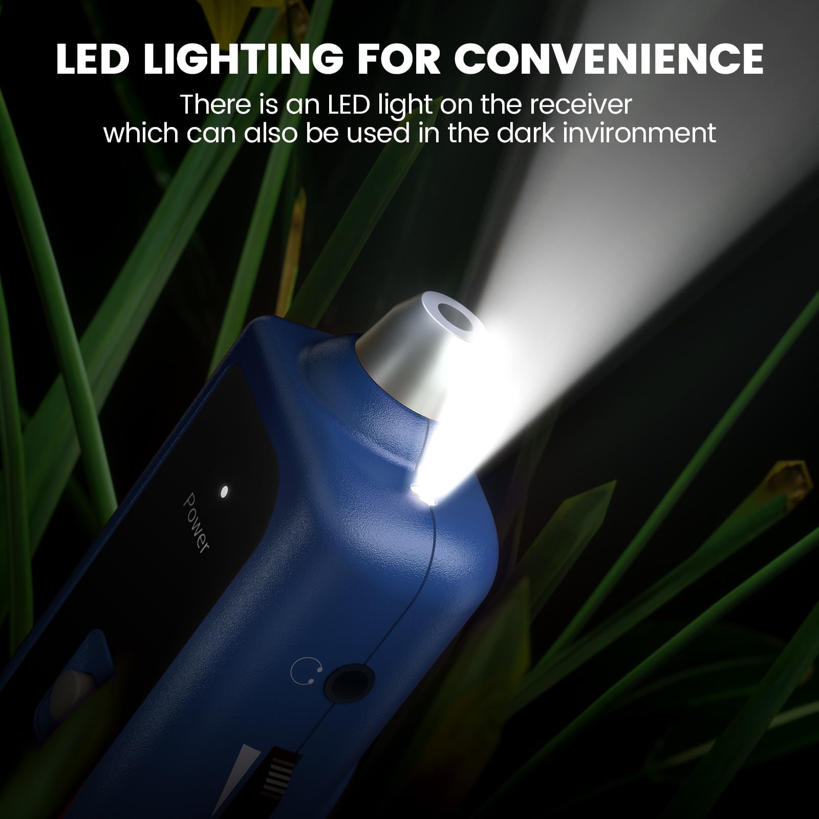 - 【White LED Flashlight&Power Supply】F02 Pro underground wire locator is designed with white LED flashlight for auxiliary lighting in the darkness. The transmitter and receiver are both powered by the 3.7V rechargeable lithium battery, both with low battery indicator.