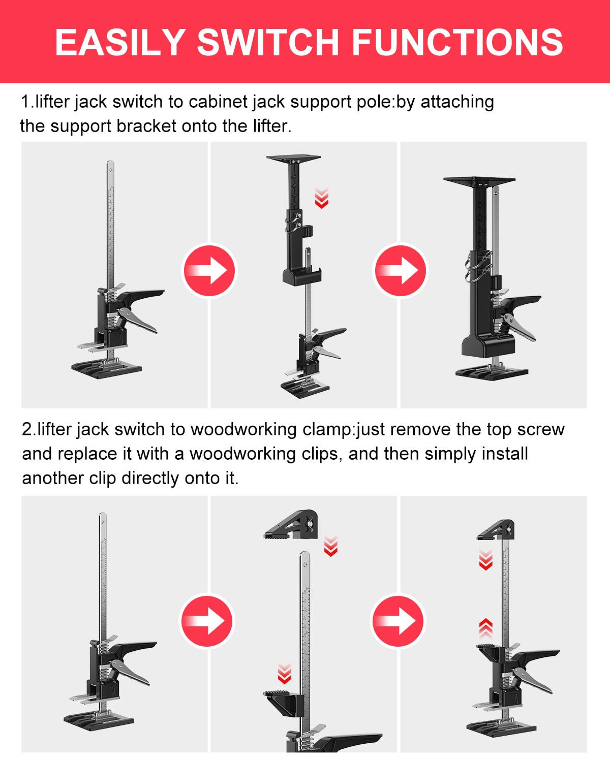 - 【Effortless Operation】 Streamline your workflow with our user-friendly design. Simply attach the support frame to the cabinet jack for seamless integration into the cabinet jack support pole. Switching to woodworking clamps is a breeze, just remove the top screw and replace it with a woodworking clips.