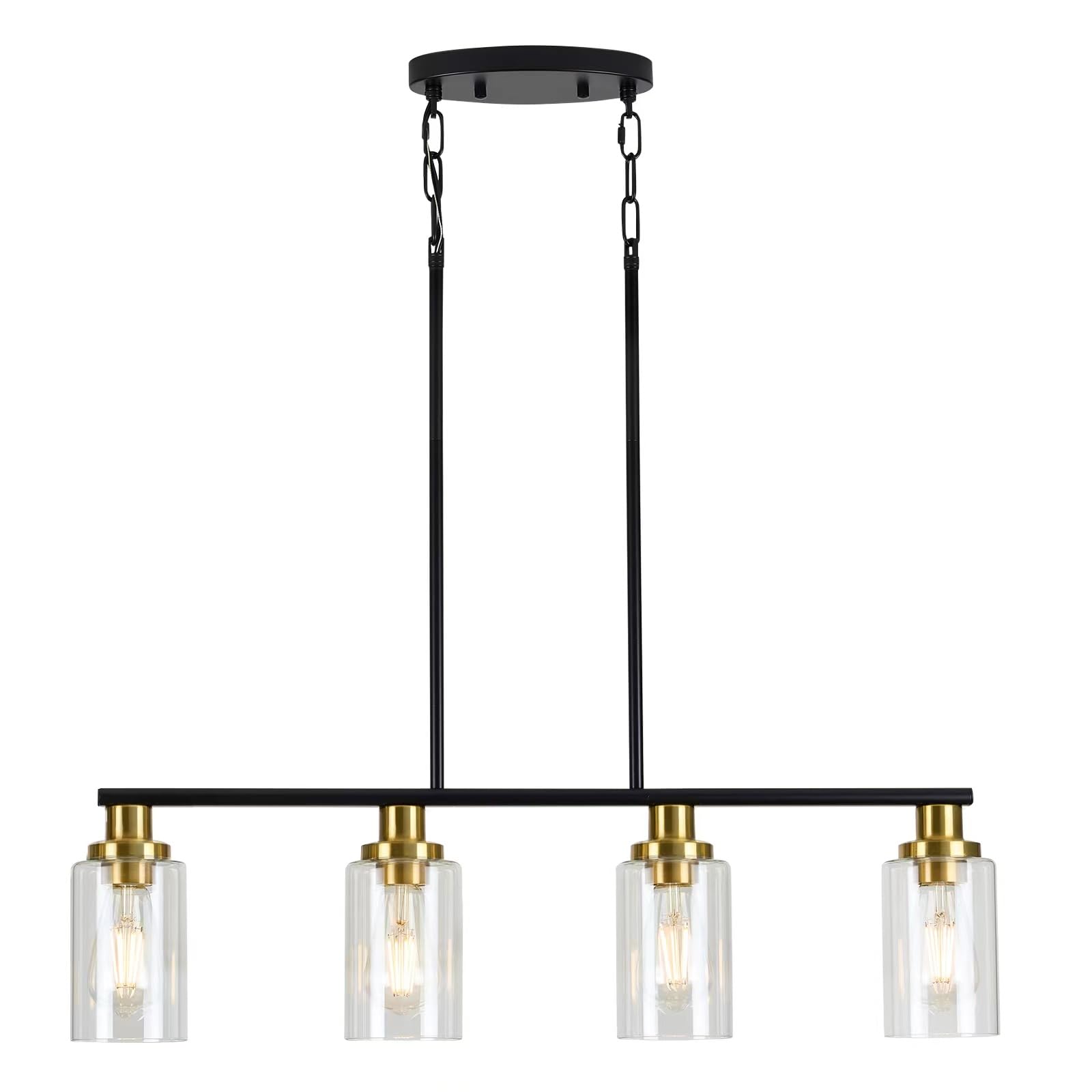 - ✅【Linear Chandelier】- Simple linear 4 chandelier for island with matte black and golden finish suit for modern and Industrial style. It also with clear glass shades has great transmission, which will illuminate all-round without dazzlation.