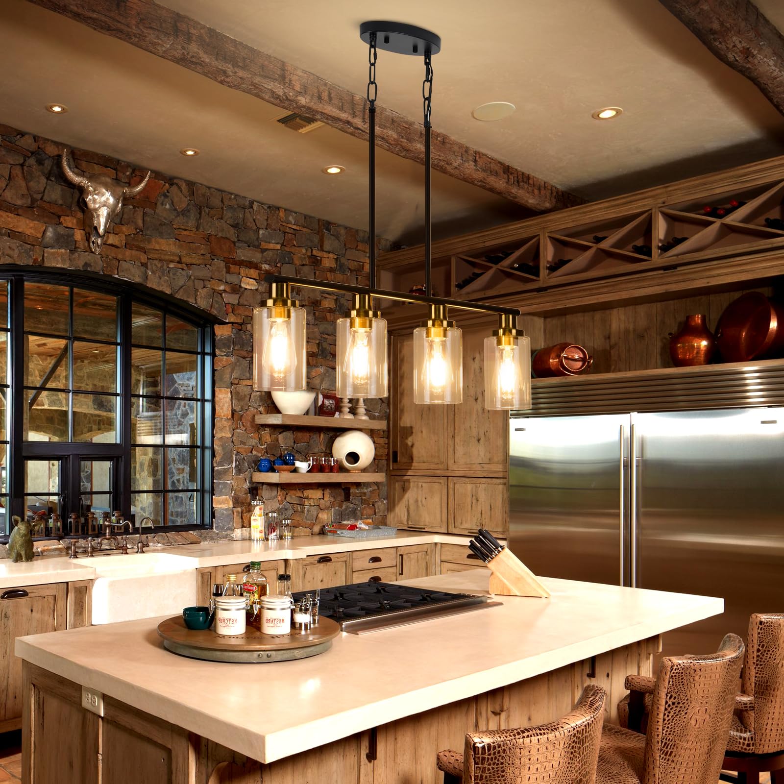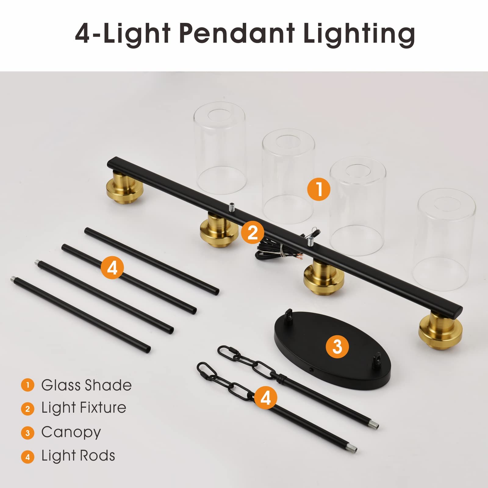 KPIOK Island Lights for Kitchen, 4-Light Farmhouse Dining Room Light Fixtures Over Table, Matte Black and Gold Linear Chandeliers for Dining Room,Industrial Pendant Lighting with Clear Glass Shade