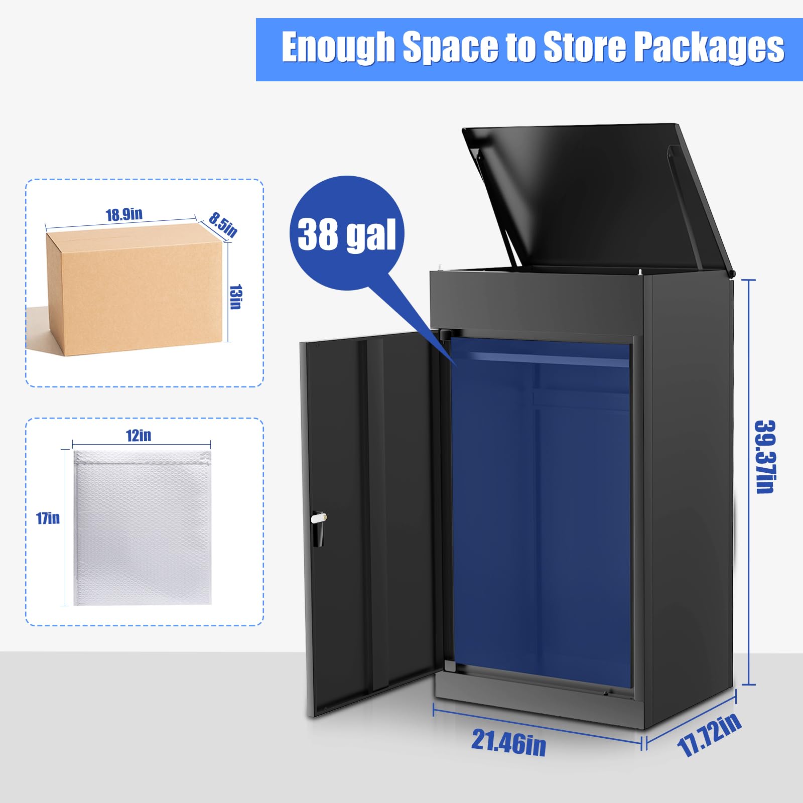 - EXTRA LARGE CAPACITY: Our anti theft package drop box measures 21.5" L X 17.7" W X 39.4" H. The interior space can hold up to 38 gallons of packages. Ideal for a variety of envelopes, file folders, and delivery boxes. No more worrying about unsigned or lost packages. It's easy to receive your packages when you're out and about