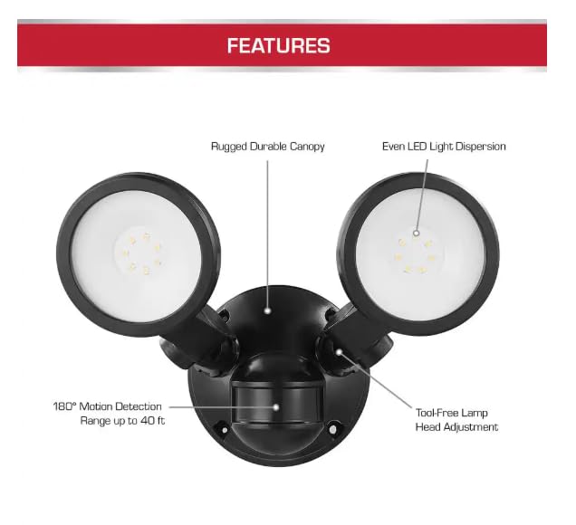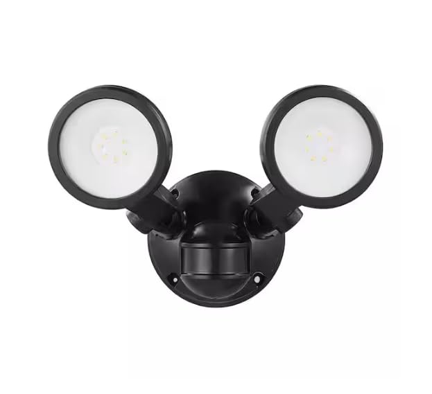 Details: Illuminate your outdoor space with this powerful dual-head LED security light fixture. The sleek black design features two adjustable light heads that provide an impressive 1000 lumens of brightness, perfect for lighting up driveways, patios, or entry points. This hardwired flood light comes equipped with advanced motion sensing technology that covers a wide 180-degree detection range and can spot movement up to 40 feet away. The fixture is designed for wall mounting and connects directly to your home's electrical system for reliable, consistent performance. Each LED head can be positioned independently, allowing you to direct light exactly where you need it. Whether you're enhancing your home's security or simply looking to light up dark corners of your property, this durable outdoor light fixture delivers both functionality and peace of mind. The integrated LED technology ensures long-lasting performance while maintaining optimal brightness throughout its lifespan.