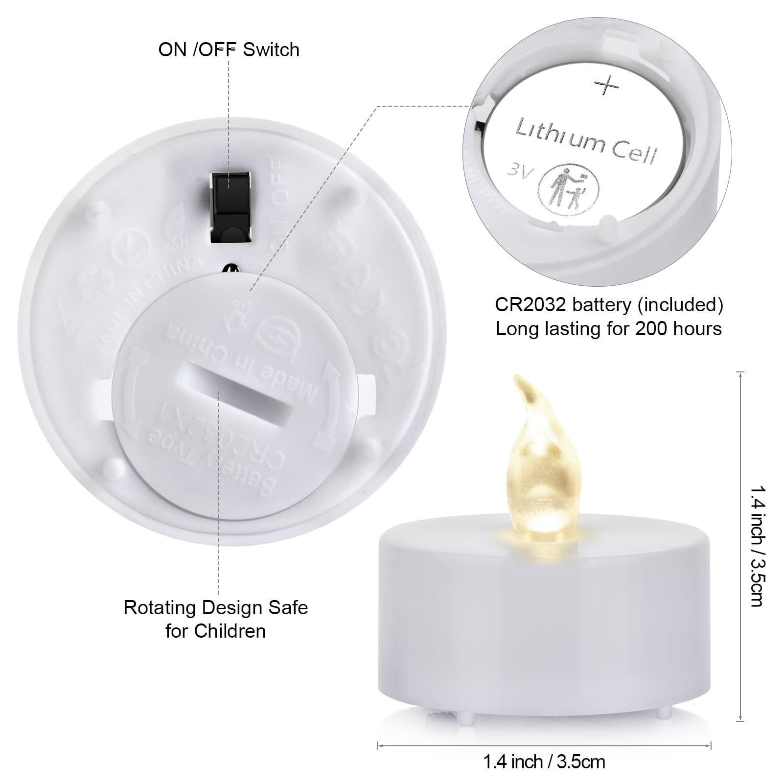 - SUPER LONG BATTERY LIFE–Each LED tea light candle uses a CR2032 button cell and can be replaced easily via the tab at the bottom.All 24 candles can last for days without turning them off.Last about 200 hours+