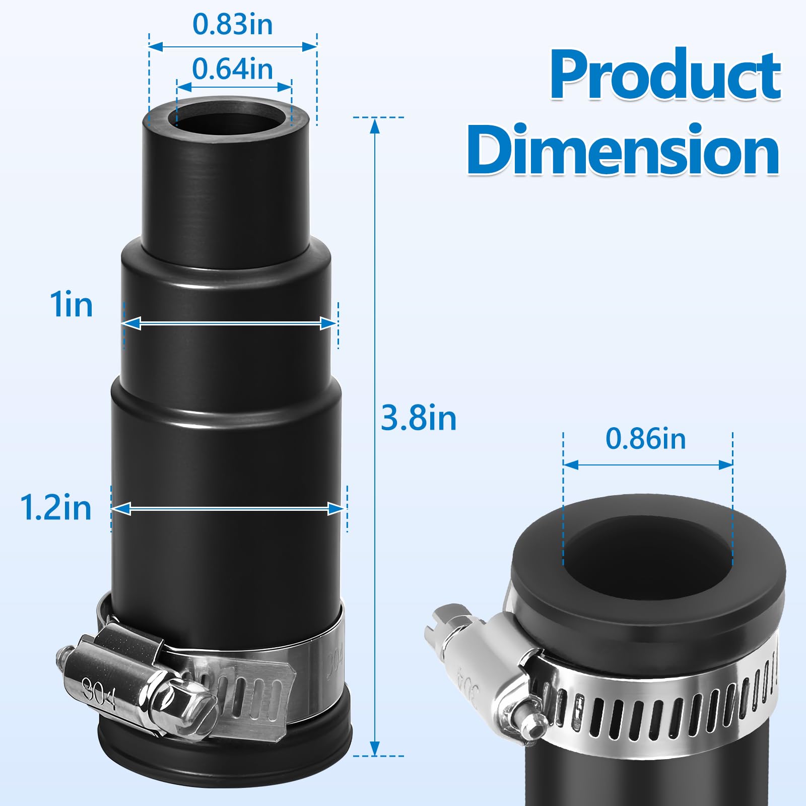 - 𝗦𝗜𝗭𝗘 𝗜𝗡𝗙𝗢𝗥𝗠𝗔𝗧𝗜𝗢𝗡: The inlet connector has a 0.64 inch inner diameter on one end and a 0.86 inch inner diameter on the other end; With a tapered design, the connector can fit on either a 0.5 inch, 0.83 inch, 1 inch or a 1.2 inch hose