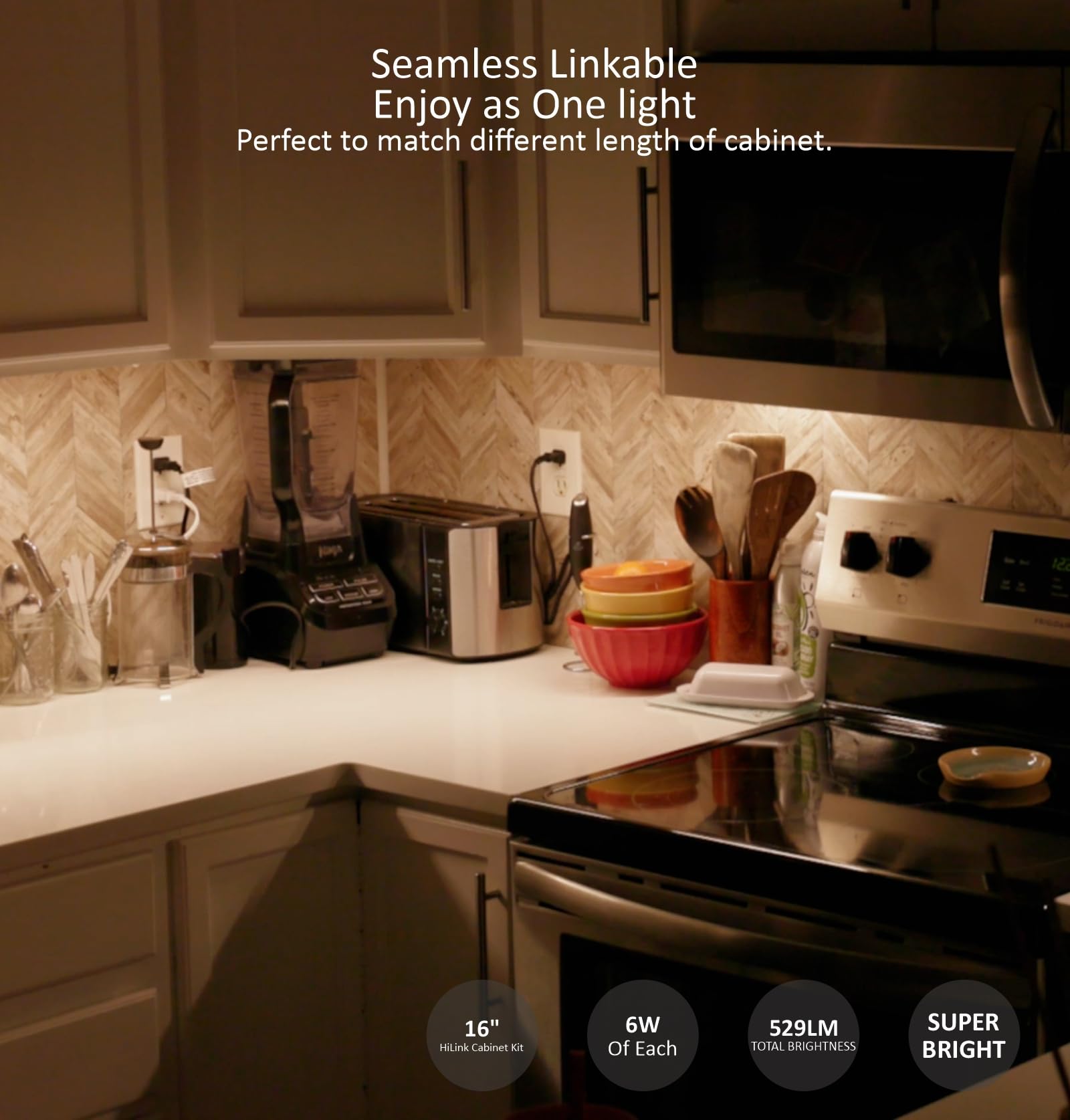 - Linkable led cabinet lights: Can be seamless linked in a split or continuous configuration. All the links looks like one under the cabinet light. Or linked by a 2 feet Junctor, flexible to be used for different length of Cabinet, Closet, Bookcase,Shelves,Display lights,Pantry lights,Plug in vanity light,hidden lights. Also comes in 12in, 16in,24in,32in