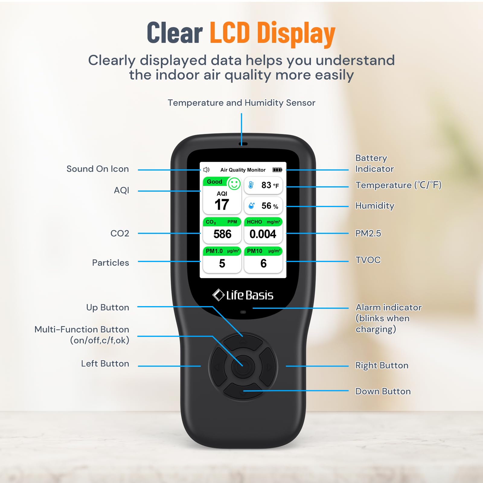 - MULTIFUNCTION MONITORING: This indoor air quality monitor provides real-time monitoring of 11 crucial indexes including AQI, CO2, PM1.0, PM2.5, PM10, Particles, HCHO, TVOC, temperature and humidity, dual alarm system-visual and audible. Life Basis air quality monitor keeps you informed of current air quality levels at all times to guarantee the breath health of your family
