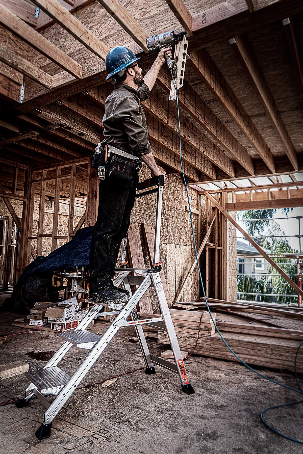 Details: The new Little Giant Jumbo Step is the ultimate combination of light weight, stability and strength. The Jumbo Step’s 8 ½-inch-wide, slip-resistant treads and stair-like design provide unmatched comfort and stability. It is ideal for jobs that require both frequent climbing up and down, as well as those that require long periods of standing. The Jumbo Step’s design makes working at heights as comfortable as standing on the ground. The patent-pending Jumbo Step also comes with a safety bar and convenient tool tray. It operates easily, and is simple to store with its slim 4 ½-inch storage depth. Its large nonslip footpads provide great traction over almost any surface. The Jumbo Step will stand up to professional and industrial use and is rated to hold up to 300 lbs. The Jumbo Step is available in 2, 3, and 4-step models.
