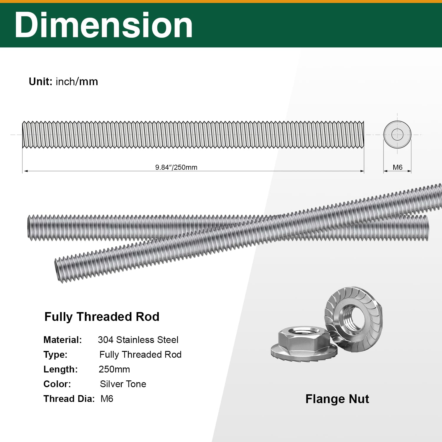 - [Package Include] Package includes 4 pcs M6x250mm fully threaded rods and 8 pcs of matching flange nuts to fit your needs.