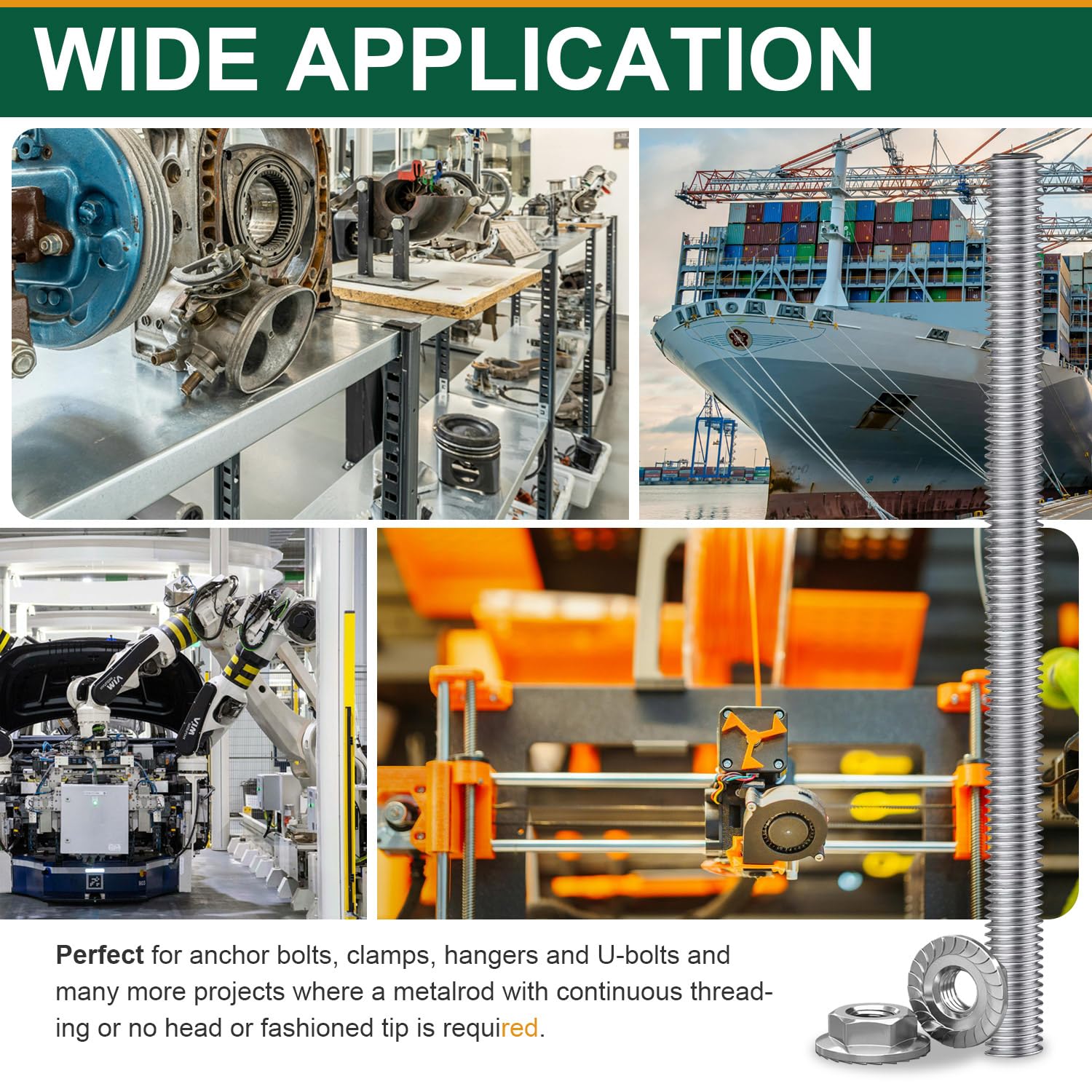 - [Versatile] Fully threaded rods are widely used in all aspects of industrial production and home life, and can be used with nuts and other items with internal threads to realize a variety of mechanical movements or connection functions.