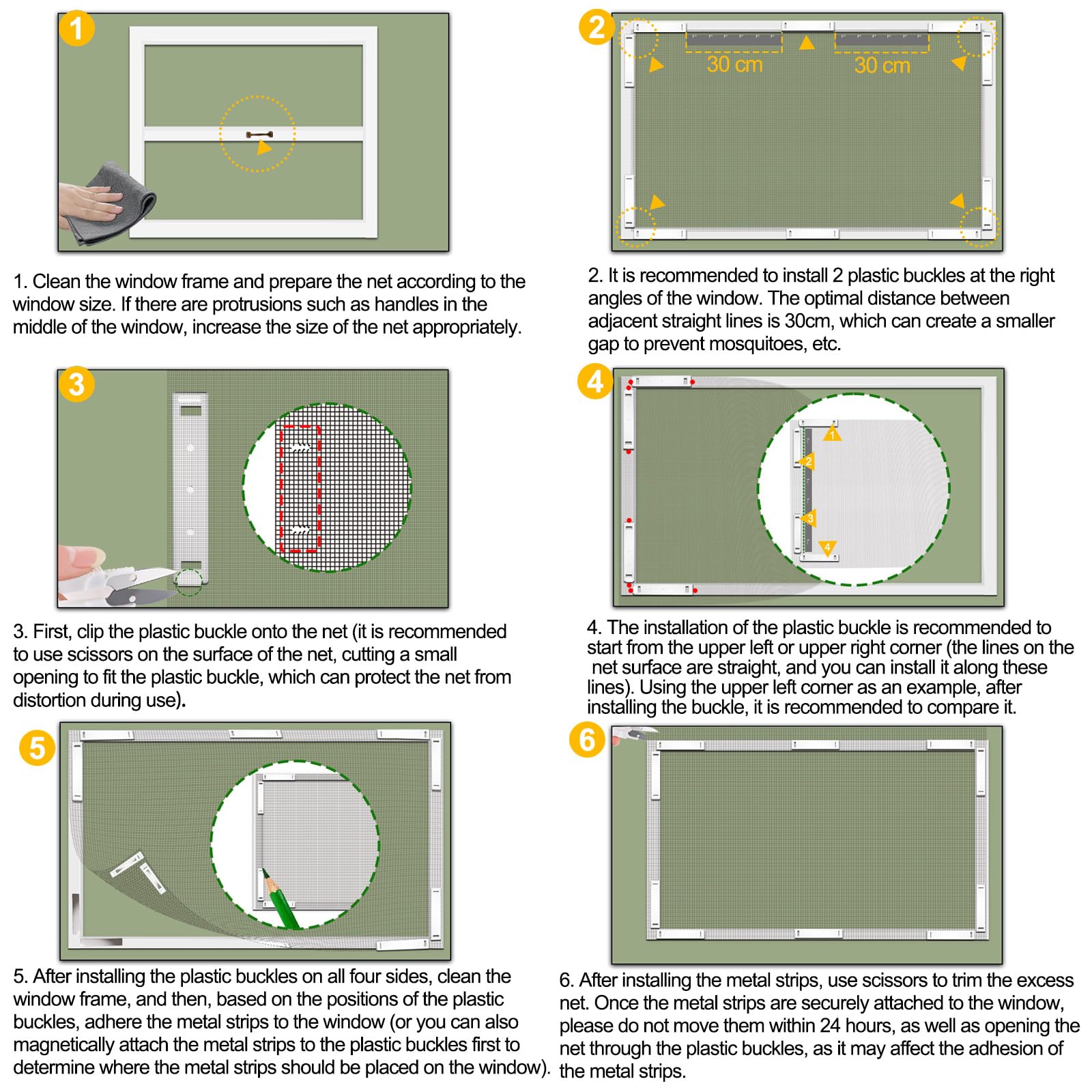- Easy Installation: Follow the instructions provided to install the 12 magnetic modules to the window frame and install the corresponding modules to the net. They snap into place simply and quickly without any drilling or screwing, keeping the window insect screen stable and secure preventing it from falling off, and we also provide a pair of scissors for you to cut