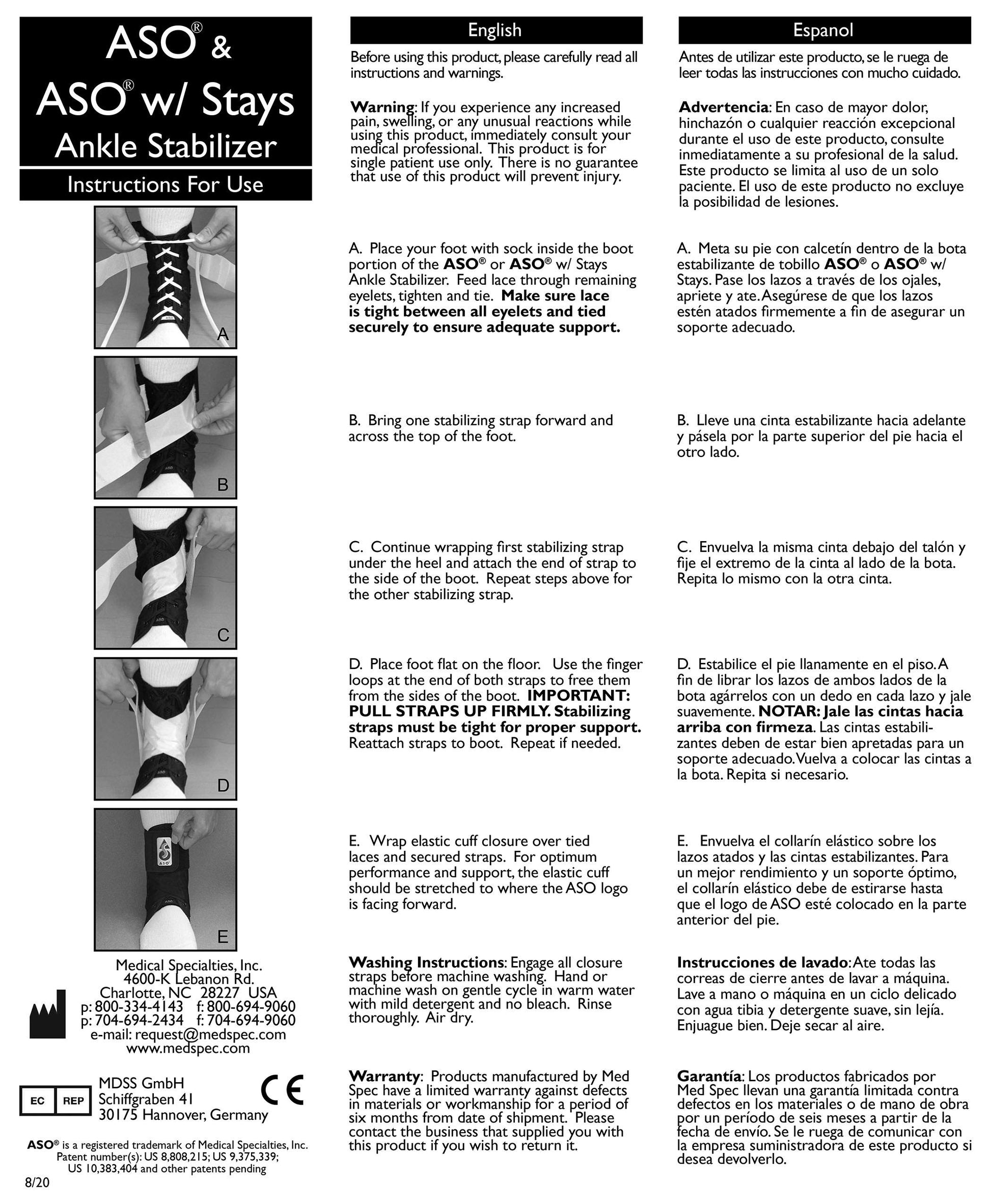 The ASO® Ankle Stabilizer is the ankle brace of choice for numerous professional and collegiate athletes. The ASO is also one of the most recommended ankle supports by athletic trainers, orthopedic surgeons and physical therapists. The ASO is one of the leading ankle braces on the market due to its unique combination of comfort, support and durability. The contoured tongue provides exceptional fit and is constructed of lightweight yet durable CoolFlex™ material. This material also lines the inside back of the boot, providing increased comfort to the Achilles area. The boot has an invisible seam to provide superior comfort. The shoelace is attached to the base of the tongue to ensure that the lace is always centered. Finger loops at the end of the stabilizing straps assist in securing straps for optimum support. ASO is a registered trademark of Medical Specialties Incorporated.