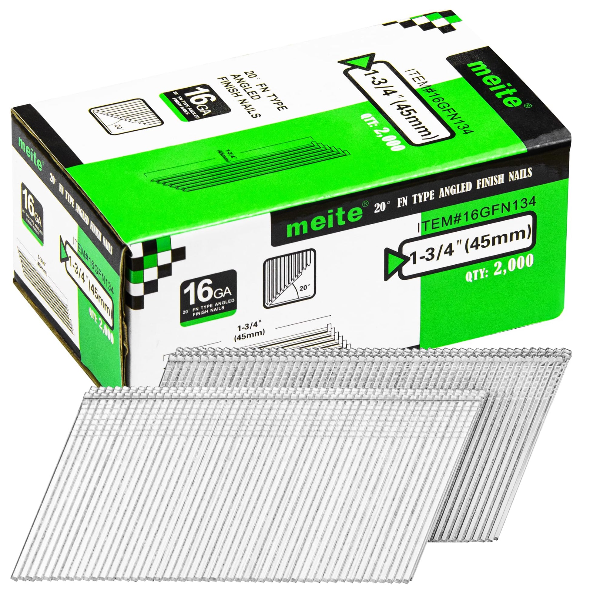 meite 16 Gauge Angled Finish Nails 1-3/4-Inch 20-Degree Galvanized Finishing Nails for Electric or Pneumatic Nailer Guns - Perfect for Window Trim, Cabinet Building and Other DIY Projects (2,000 PCS)