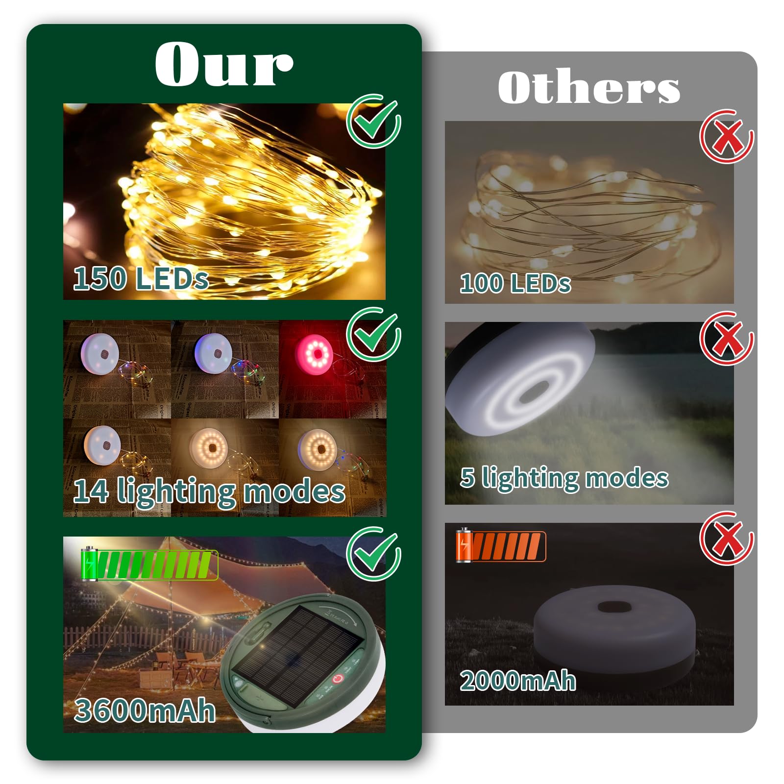 - 180 LEDs String Lights — Solar camping string lights 32.8-foot string lights feature 150 dense LEDs, offering a fairy string light effect perfect for camping and decor. The camping lamp have 30 leds provide brighter light and wider lighting area,making them ideal as portable lights for camping, traveling, or tent lighting. They’re also great for birthday parties, Christmas decorations, and more!