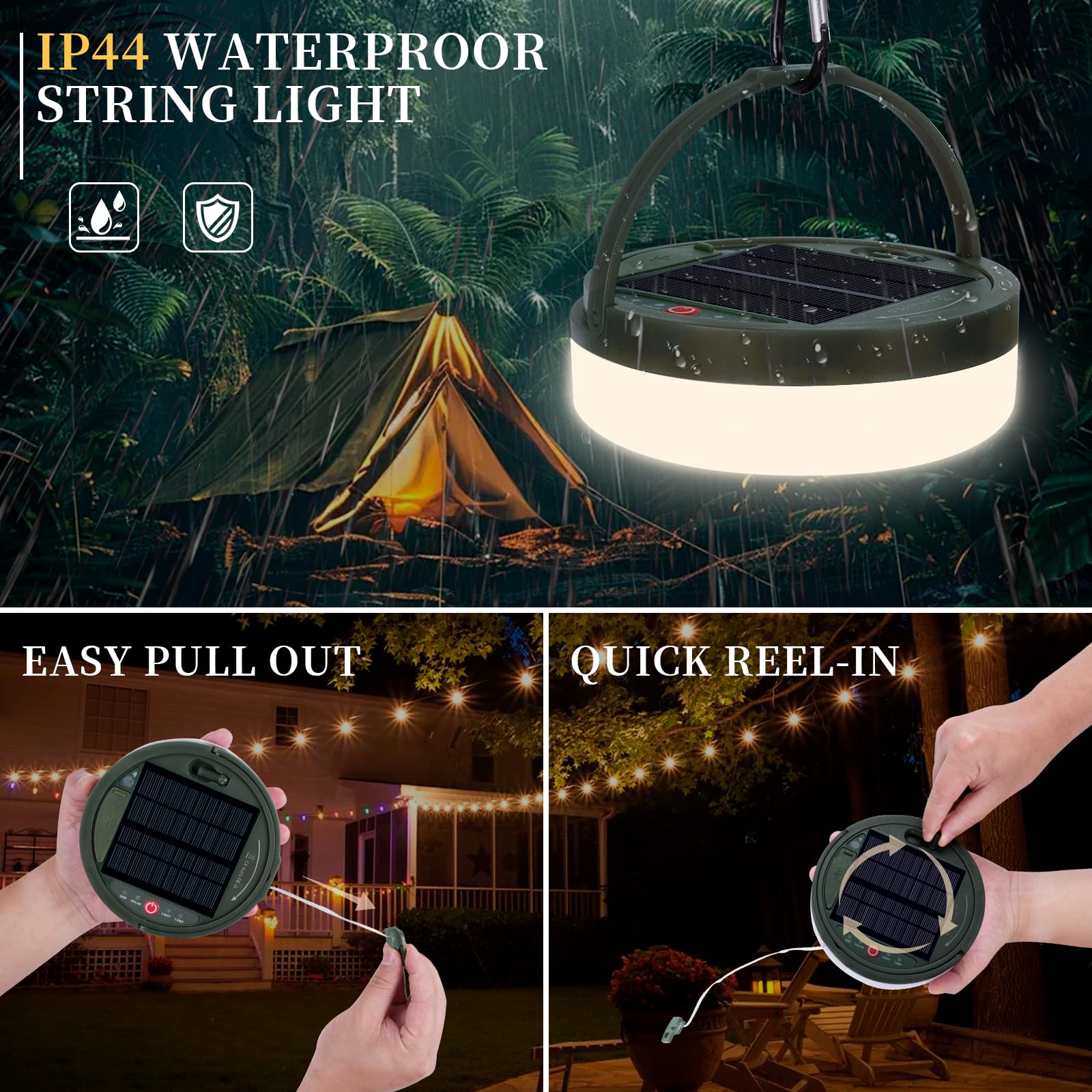 - Solar And Usb-C Charging — The camping light has a built-in 3600mAh battery, and the rechargeable string light can last from 8 to 18 hours when fully charged, depending on the mode selected. When charging, the power indicator light is red to let you know the charging status clearly. In addition, this camping light can also be used as a mobile power source, allowing you to charge your cell phone while camping or hiking!