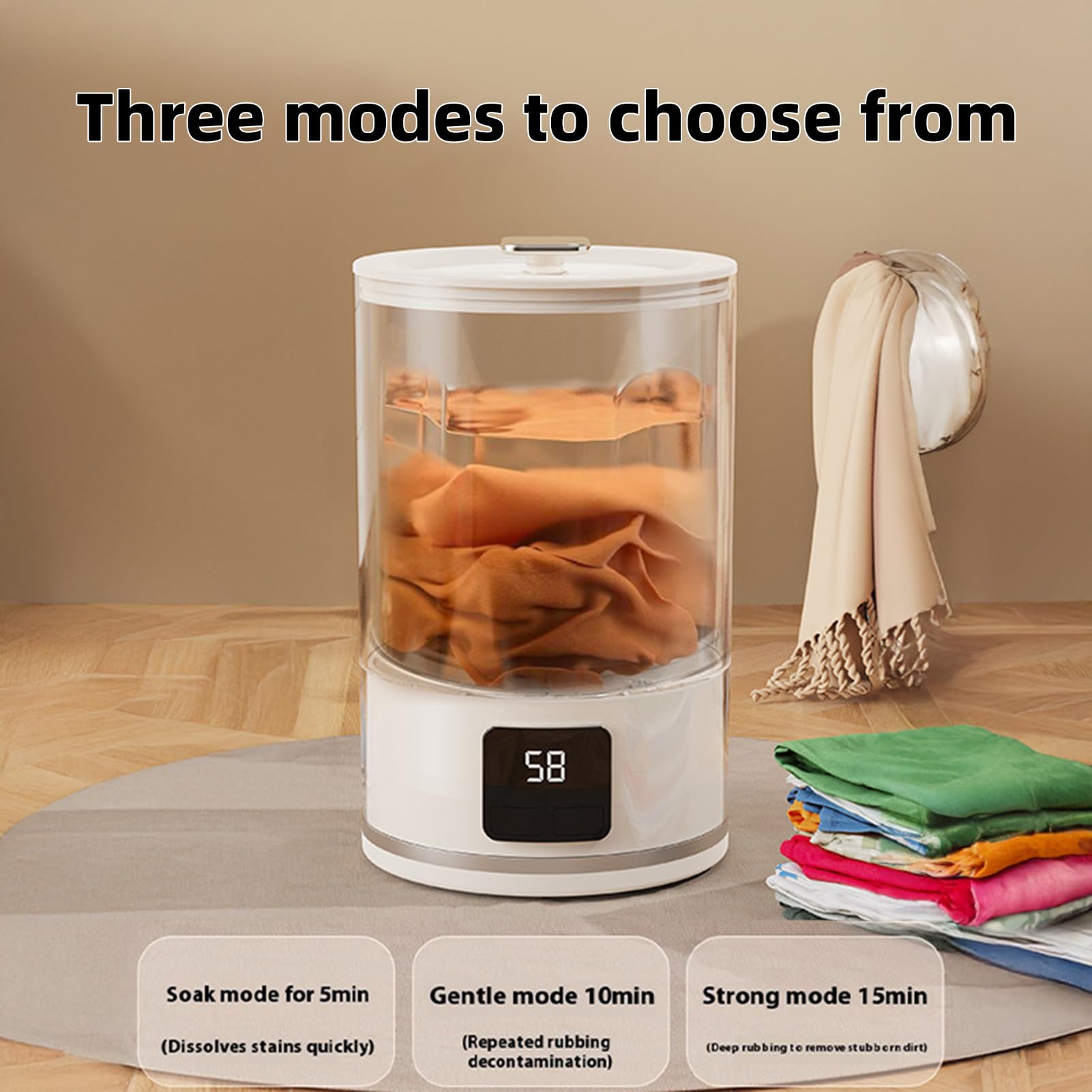 - 【3 Cleaning Modes for Gentle or Strong Washes】:Choose from Soak, Gentle, or Strong modes depending on the garment type. With up to 15 minutes of wash time and 1000 RPM speed, it’s suitable as a mini laundry machine for delicate items.