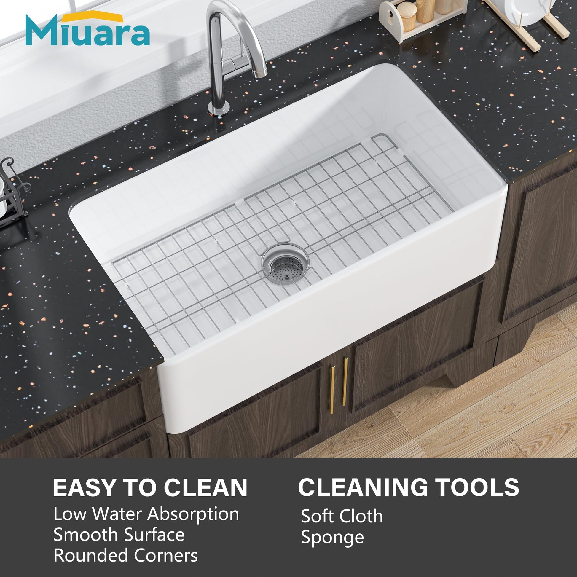 - 【Fine Fireclay Sturdy Farmhouse Sink】Miuara farmhouse sink 33 inch is made of fine natural fireclay fired at extremely high temperature above 2600℉ for 26 hours,it’s very hard and sturdy.And the solid core construction makes the fireclay farm sink superior strengthen and durable to withstand heavy use, which is highly resistant to impact,thermal shock, crack and scratch.Miuara white apron sink is classic and gorgeous!