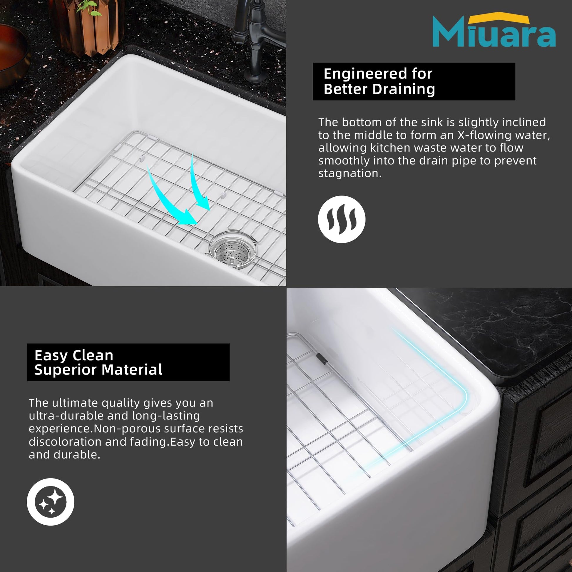 - 【Worry-free Warranty】Miuara values every customer's shopping experience, our farmhouse sinks come with lifetime after-sales and 5-year limited warranty. If you have any questions about the fireclay apron sink, Please contact us promptly and we will provide professional solution within 24 hours.