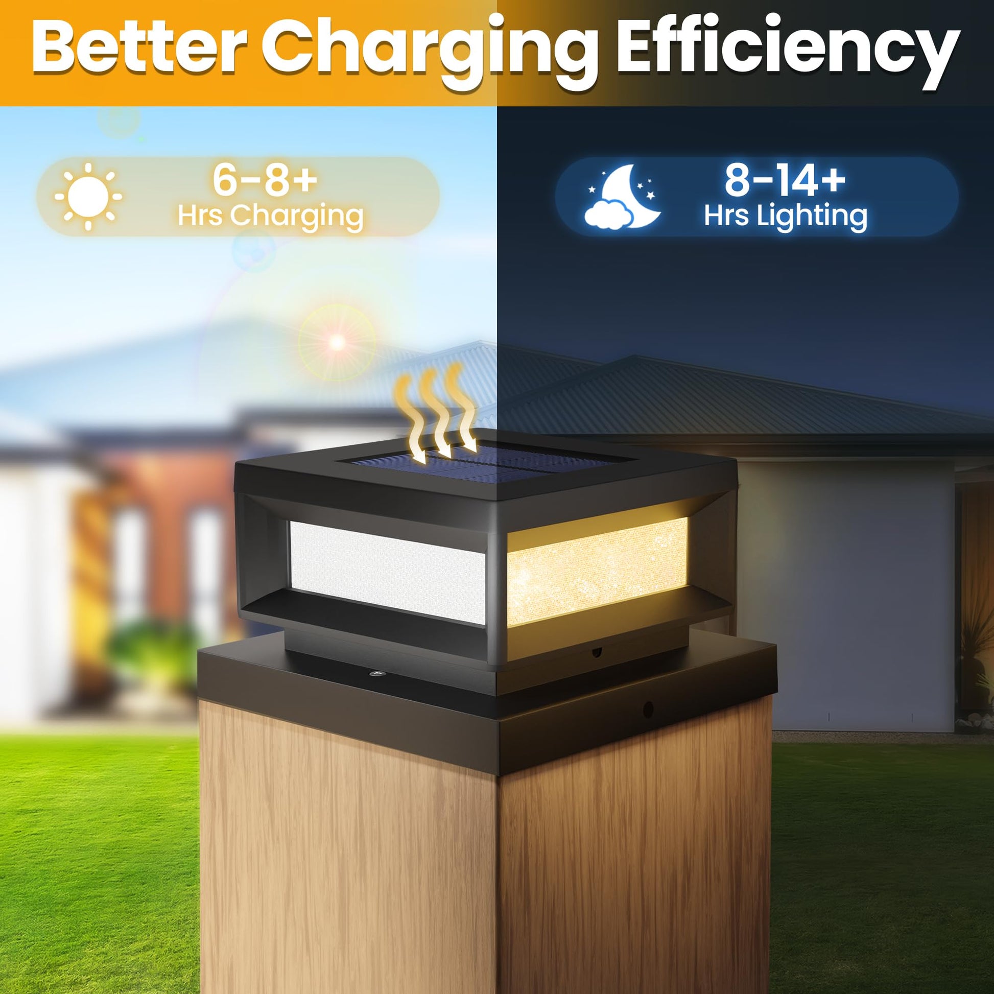 - Enhanced durability: These solar fence post lights can illuminate for 8-12+ hours once charged for 6-8+ hours in direct sunlight, surpassing the longevity of other outdoor solar lights. This is attributed to our improved solar panel, featuring a larger surface area and increased conversion efficiency. No electrical power is needed