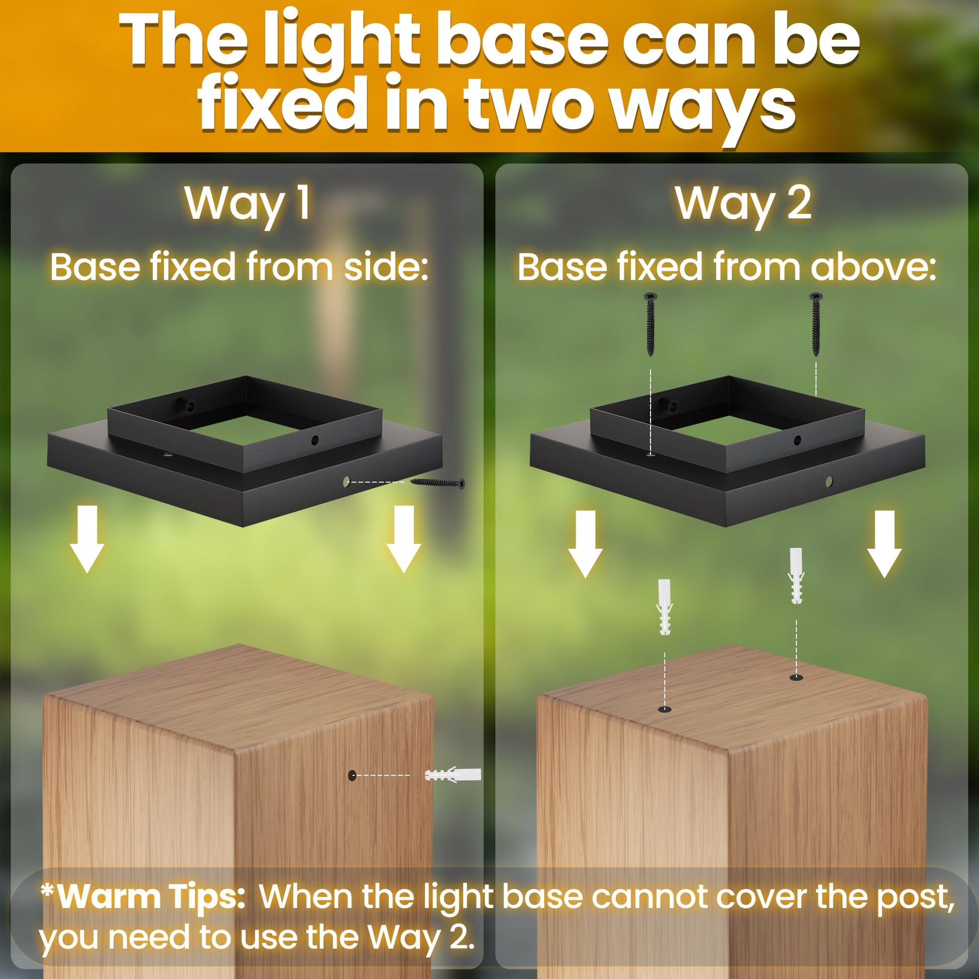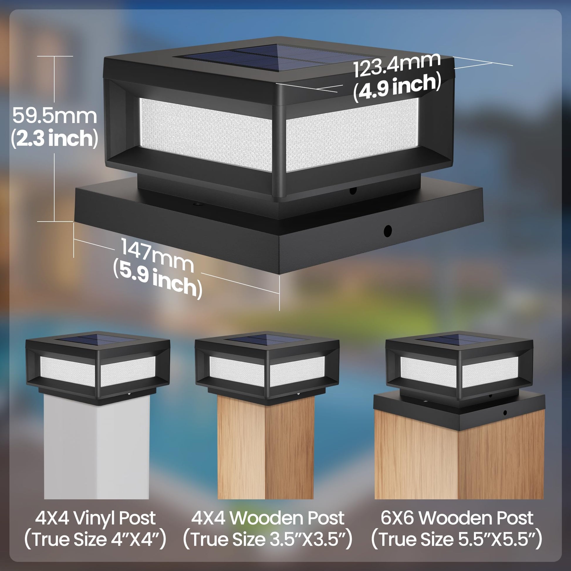 - Applicables sizes: Our range of solar fence post caps includes sizes suitable for various needs, such as 4x4 or 6x6 wooden posts, and 4x4 vinyl posts. This ensures compatibility with wooden posts measuring 3.5"x 3.5" or 5.5"x 5.5", and vinyl posts measuring 4"x 4". Say goodbye to the hassle of complex wiring – simply secure the screws into the post for quick and easy installation