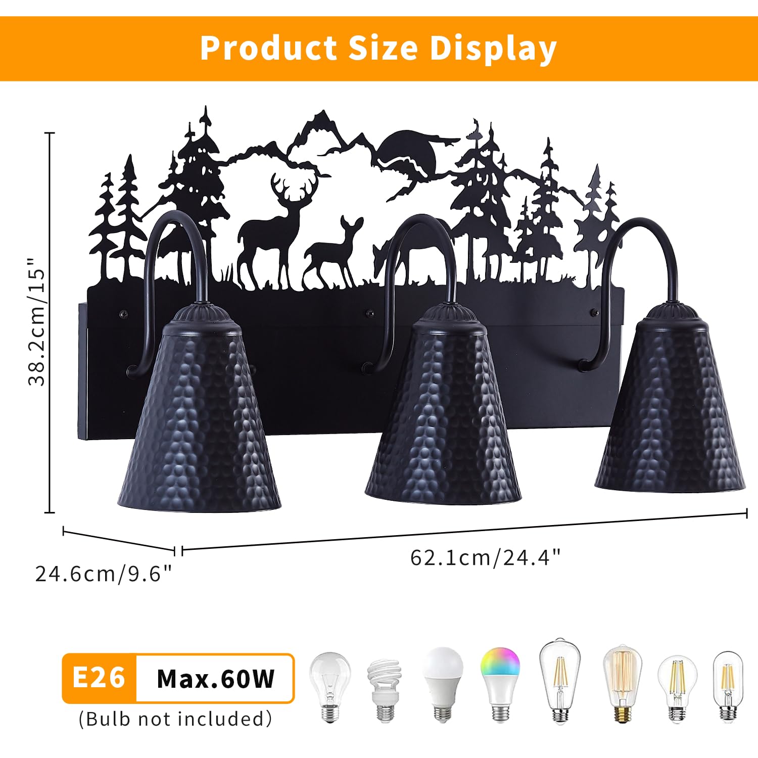 Monaxon Farmhouse Bathroom Vanity Light with Deer Design - E26 Base 3-Light Black Metal Rustic Wall Fixture for Mirror Lighting, and Dressing Table (Large, Bulb Not Included)
